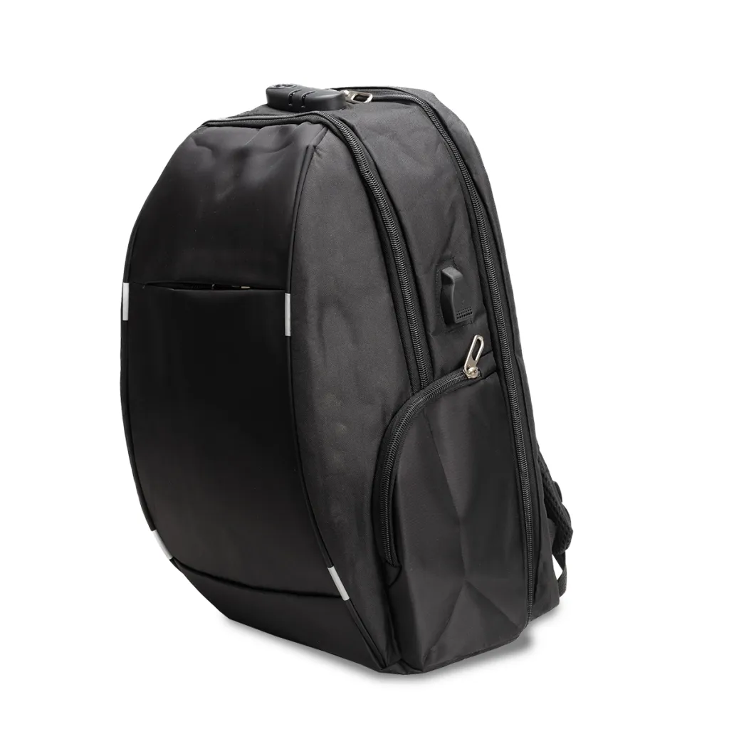 Backpack with a 15" laptop compartment secured with a lock with individual lock. Outside, zipped front pocket and USB socket on the side, thanks to which you can connect your smartphone to a power bank. USB cable included. Soft, comfortable back and shoulder straps are covered with mesh. The backpack has a strap for the suitcase handle. The backpack prevents access by other people.