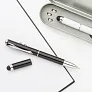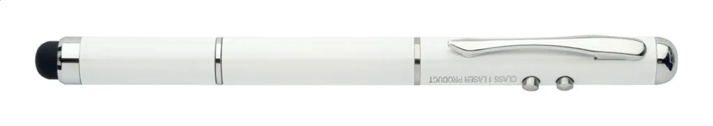 Multifunctional laser pointer with ballpoint and touch screen pen and LED light. In metal gift box with button cell batteries and blue refill.