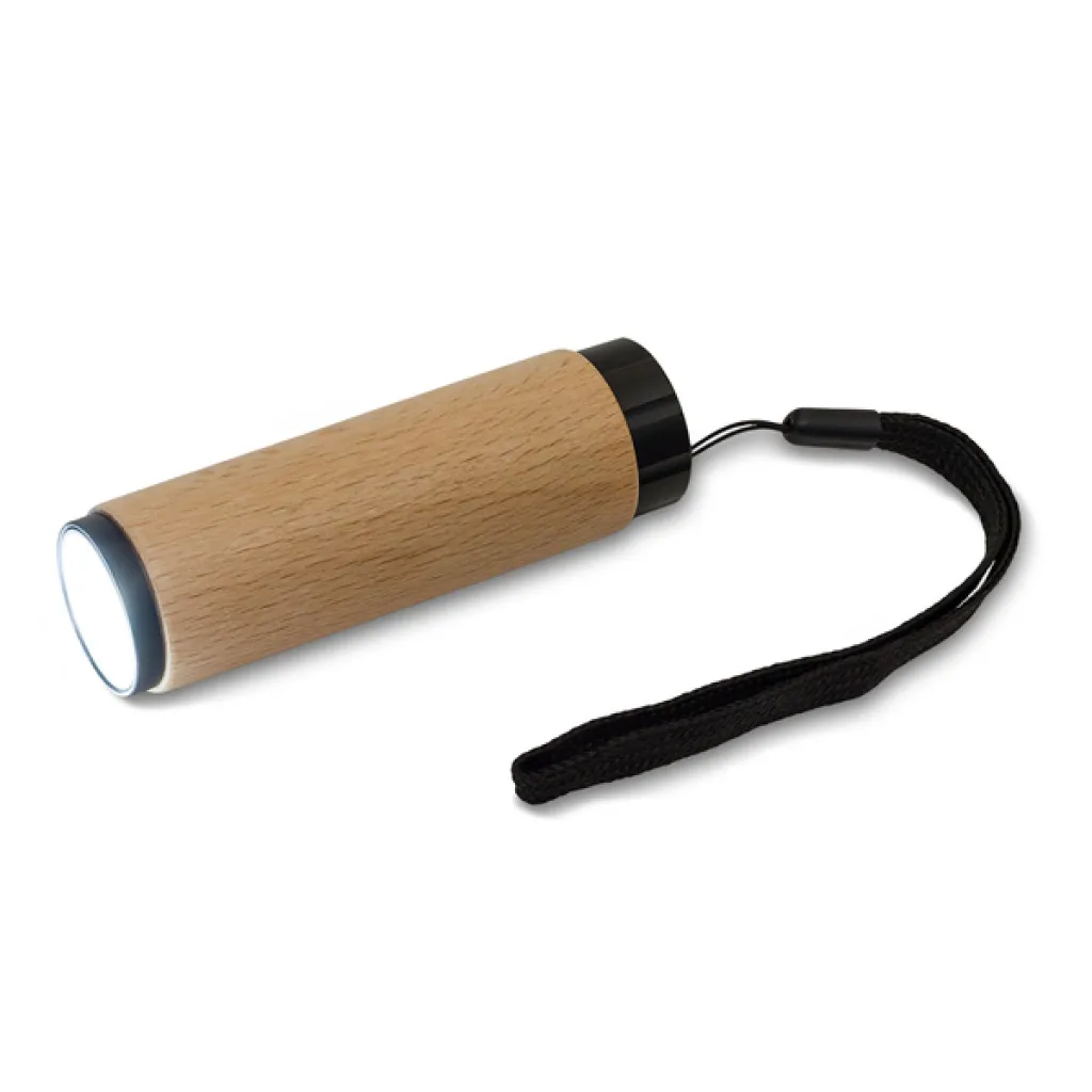 Beech wood shell LED torch. 1W, COB light, equipped with holding strap. 3 AAA batteries included.