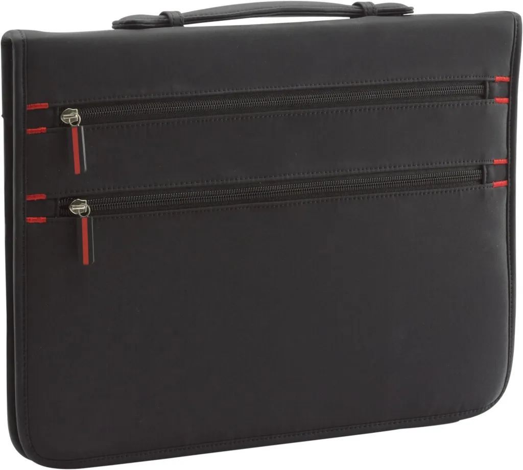 PVC zipped conference folder (approx. A4) with notepad with 20 lined pages, a calculator and multiple pockets, including two pockets with zipper on the front.