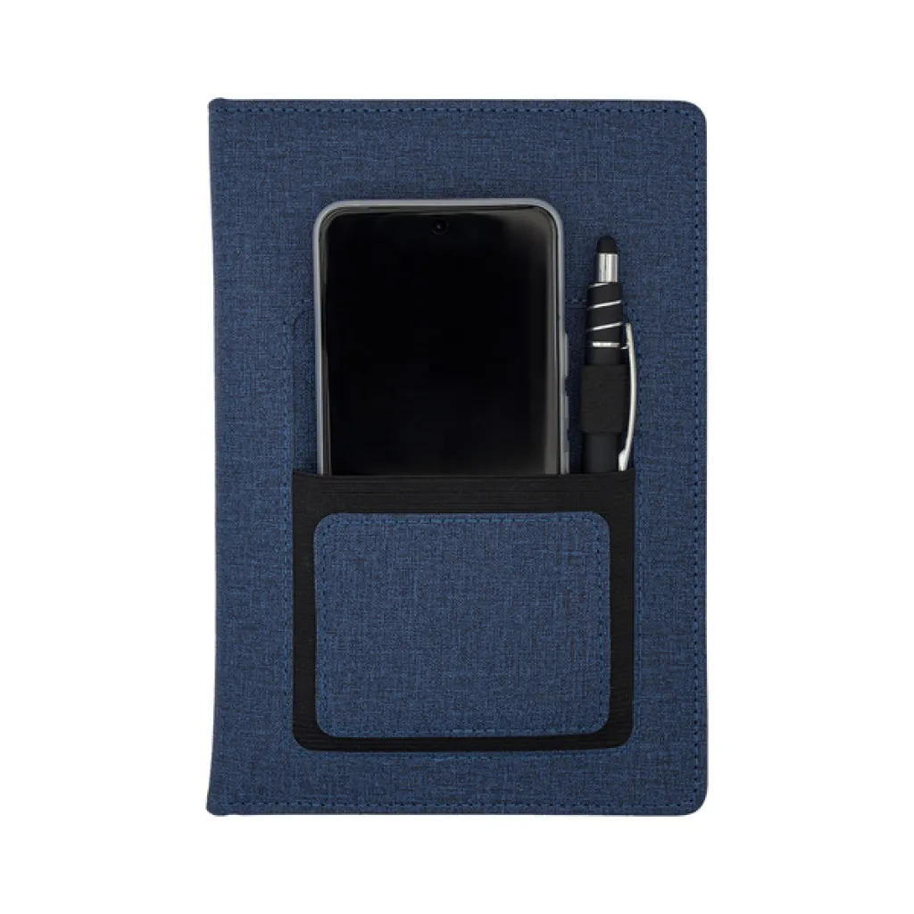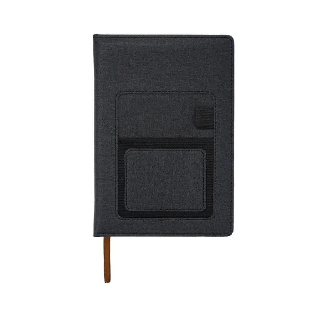 A5, hard cover notebook equipped with pocket. Stretchable pocket for mobile phone. Elegant rigid frame. Elastic pen loop. 80 sheets with lines, 80 g/m2.