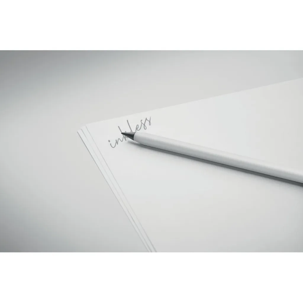 Long lasting recycled aluminium inkless pen. The pen writes with the graphite tip that has a plastic protection cover.