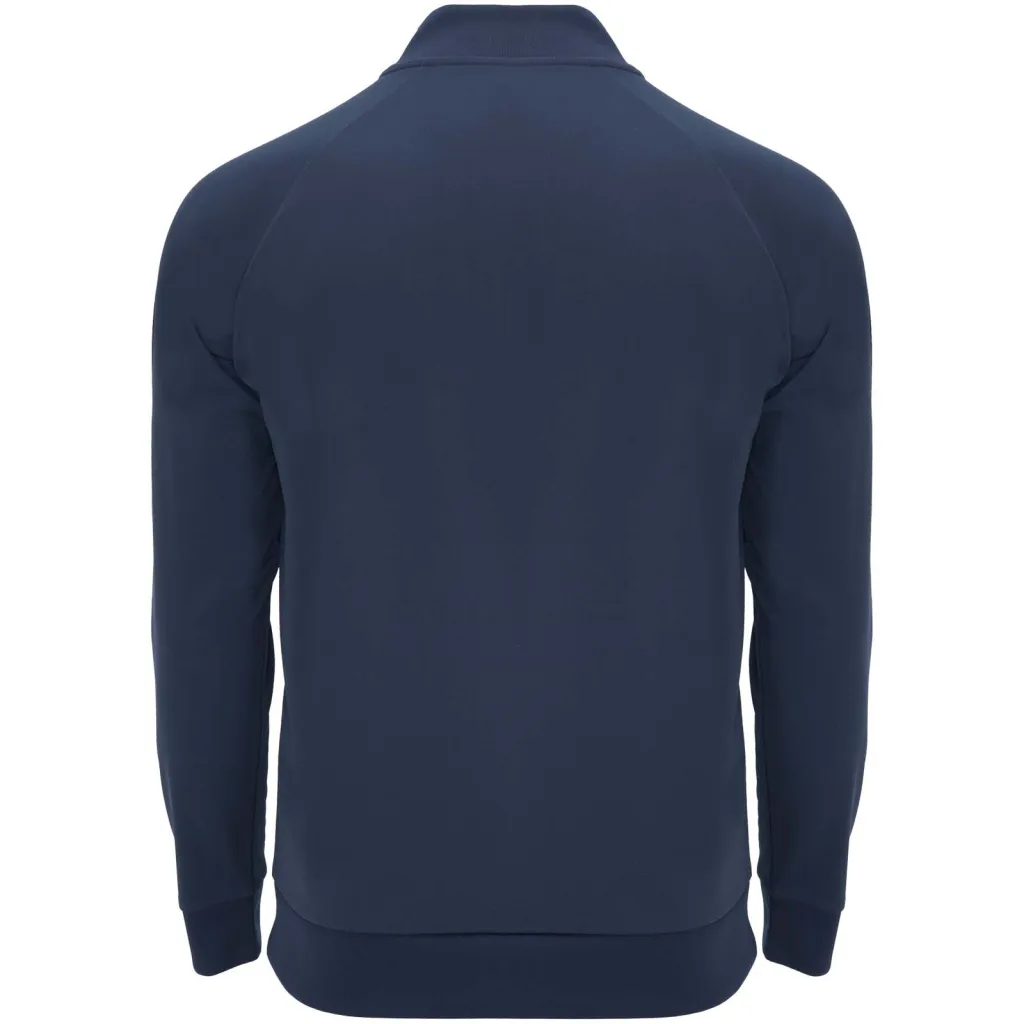 Technical fabric. Raglan sleeves. Inner fleece. Collar with half zipper and matching reinforced covered seams. 1x1 rib in back collar, cuffs and hem. Removable label. Sweatshirt to match with Neapolis trousers.