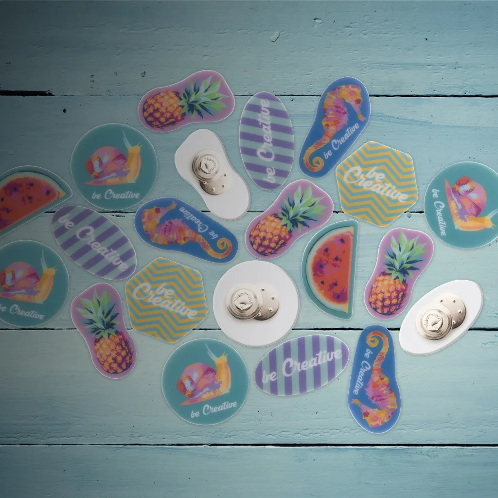 Custom made plastic badge with magnetic pin and full colour printing. Produced in custom shape - maximum size: 50x50 mm. Price includes UV LED printing. MOQ: 100 pcs.