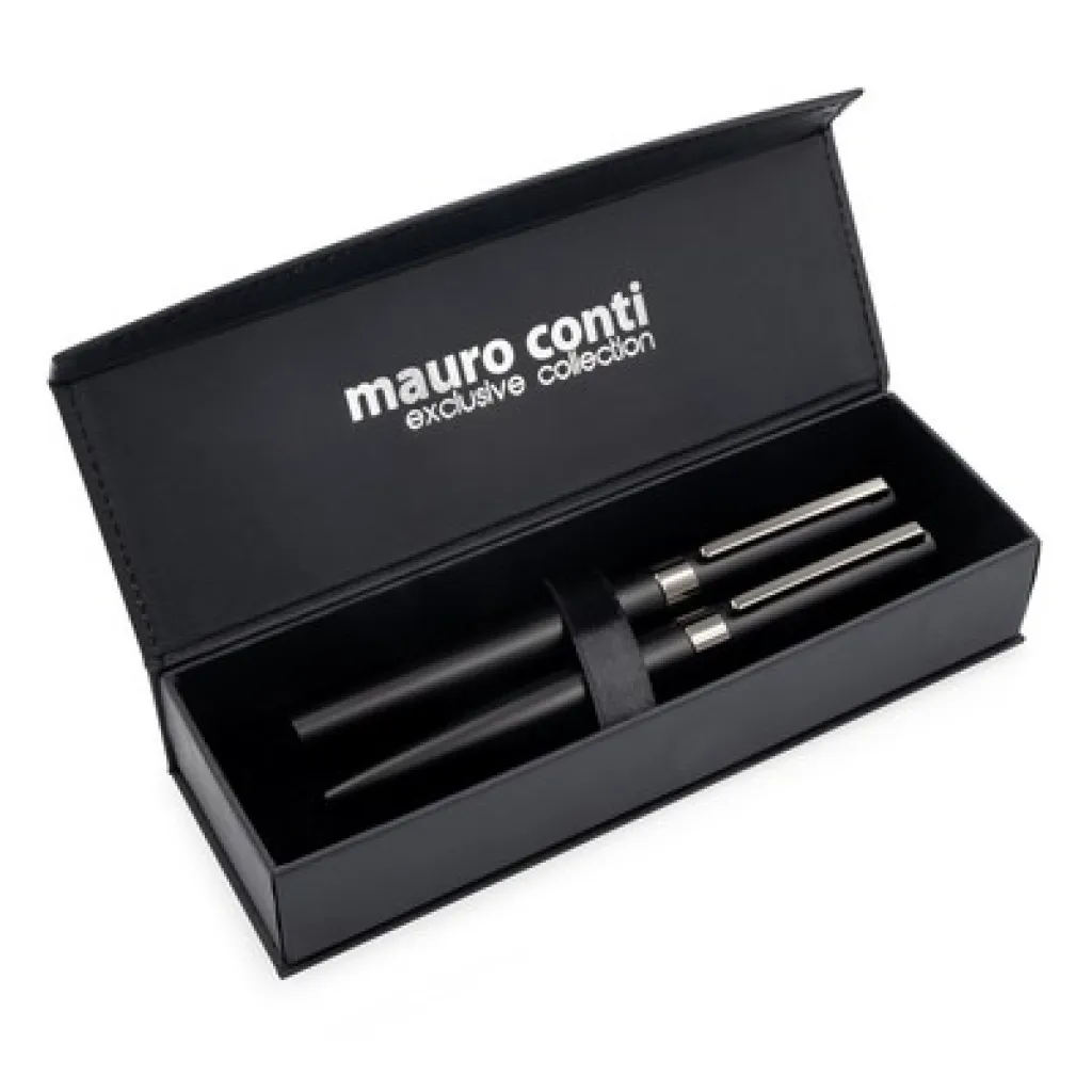 Mauro Conti writing set, ball pen and roller ball pen with black barrel and shiny trim parts, packed in gift box