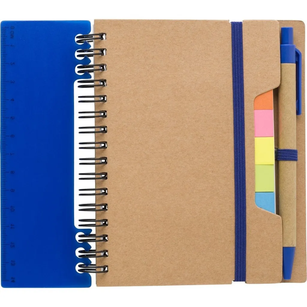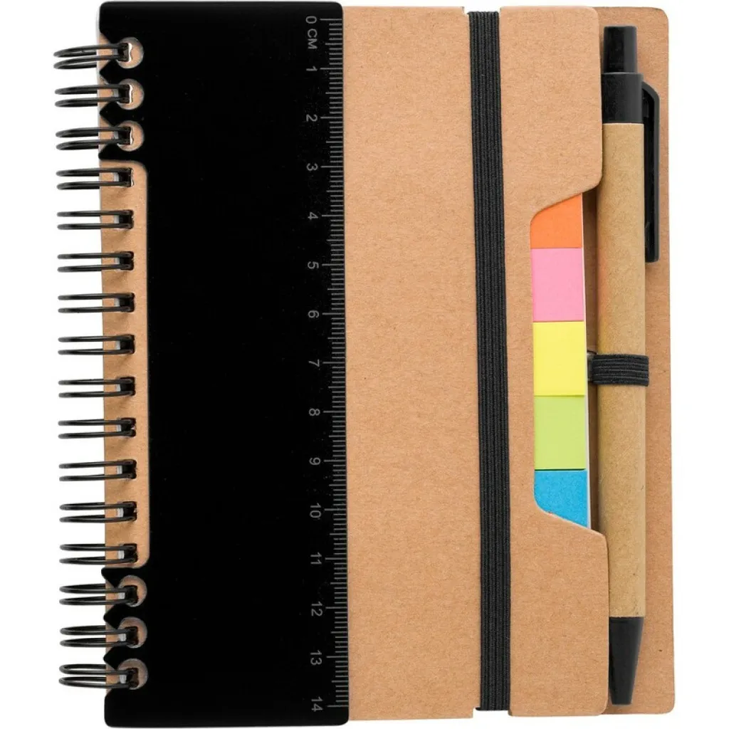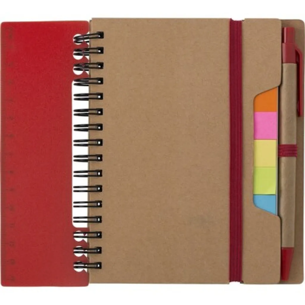 Memo holder, notebook (60 sheets of recycled, lined paper), ball pen, ruler, 125 sticky notes (25 pcs per colour), spiral binding
