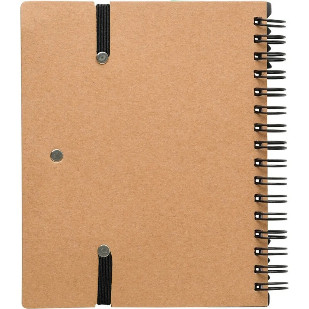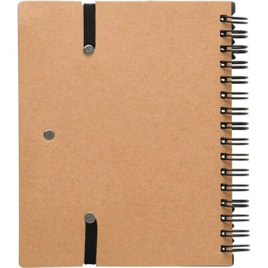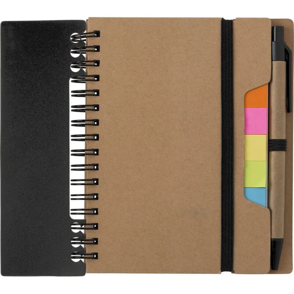 Memo holder, notebook (60 sheets of recycled, lined paper), ball pen, ruler, 125 sticky notes (25 pcs per colour), spiral binding