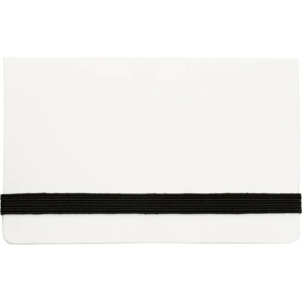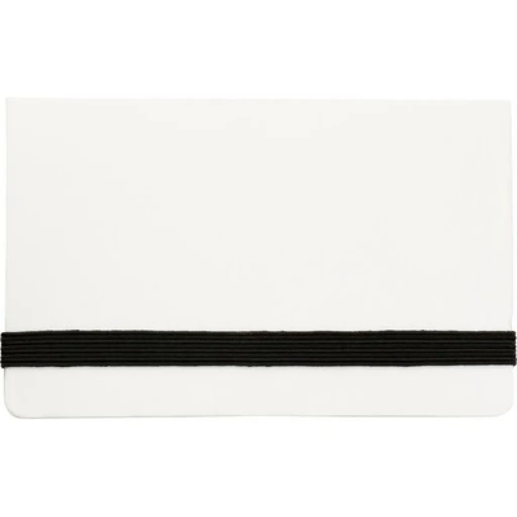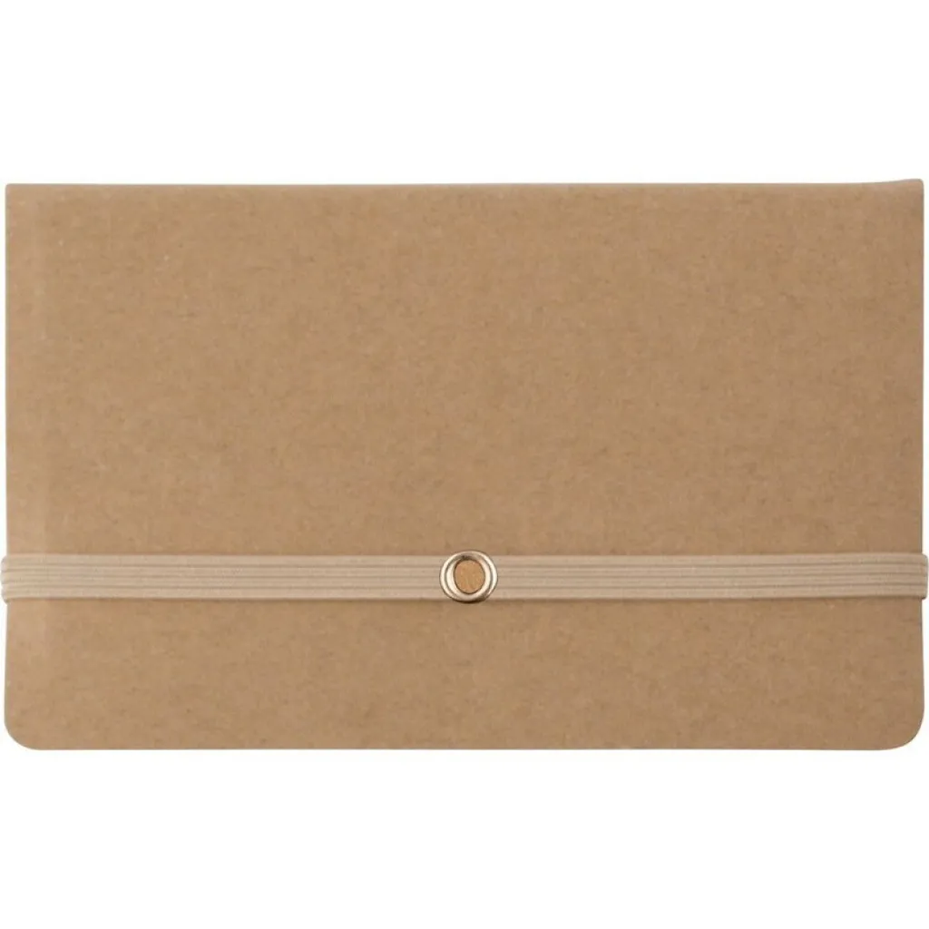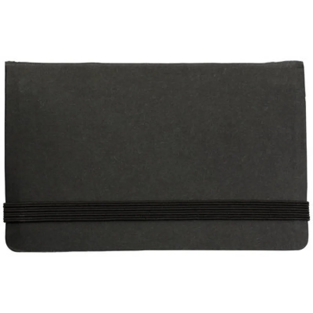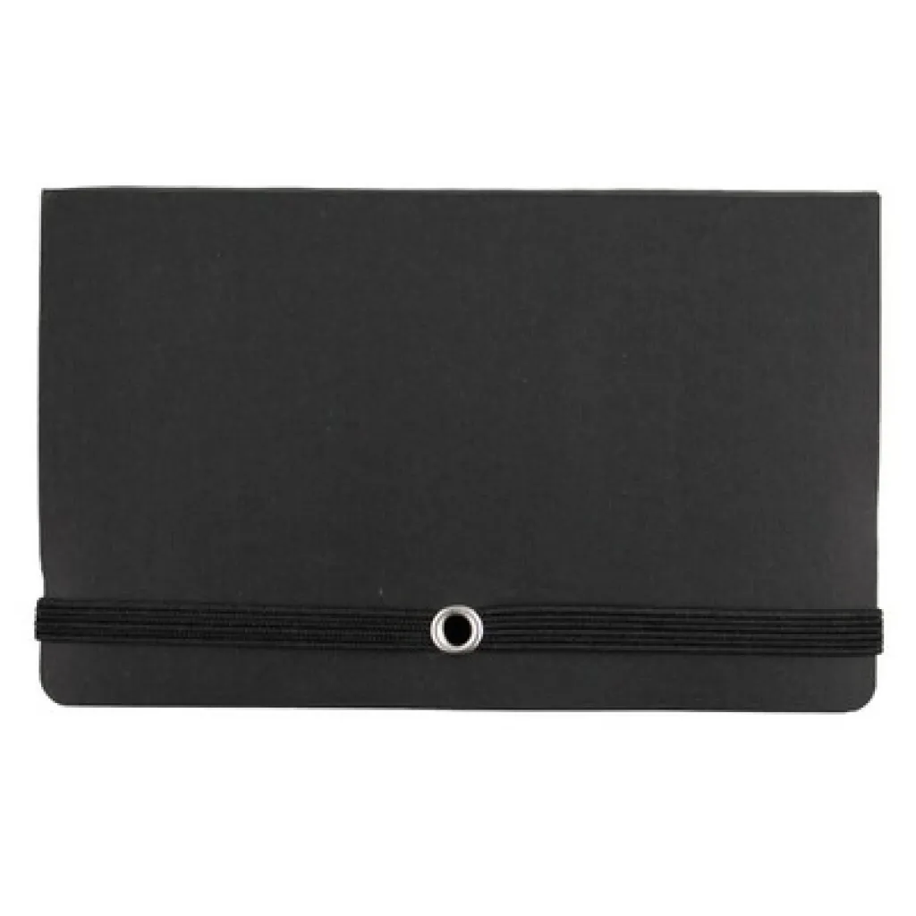 Case with 150 sticky notes, inside pocket for business cards and elastic band for closing