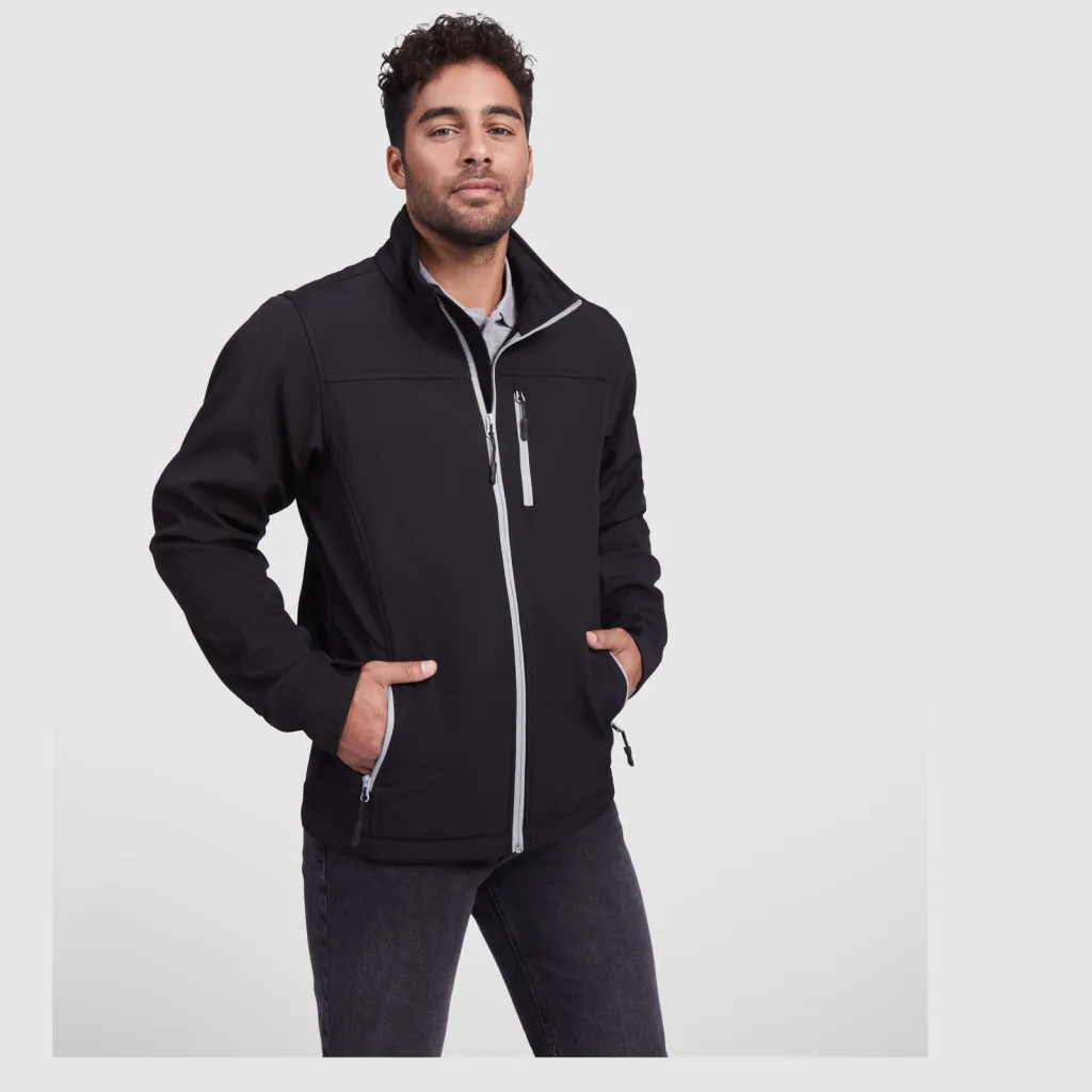 2-layer softshell. Inverted sealed effect zip with matching chin protector and zipper puller. Cut detail on chest. Three zip pockets with matching puller. Velcro fasteners in cuffs. Adjustable bottom hem with elastic drawcord and stoppers. 1000 mm water resistant. Wind-proof fabric. The model is 185 cm and is wearing size M.