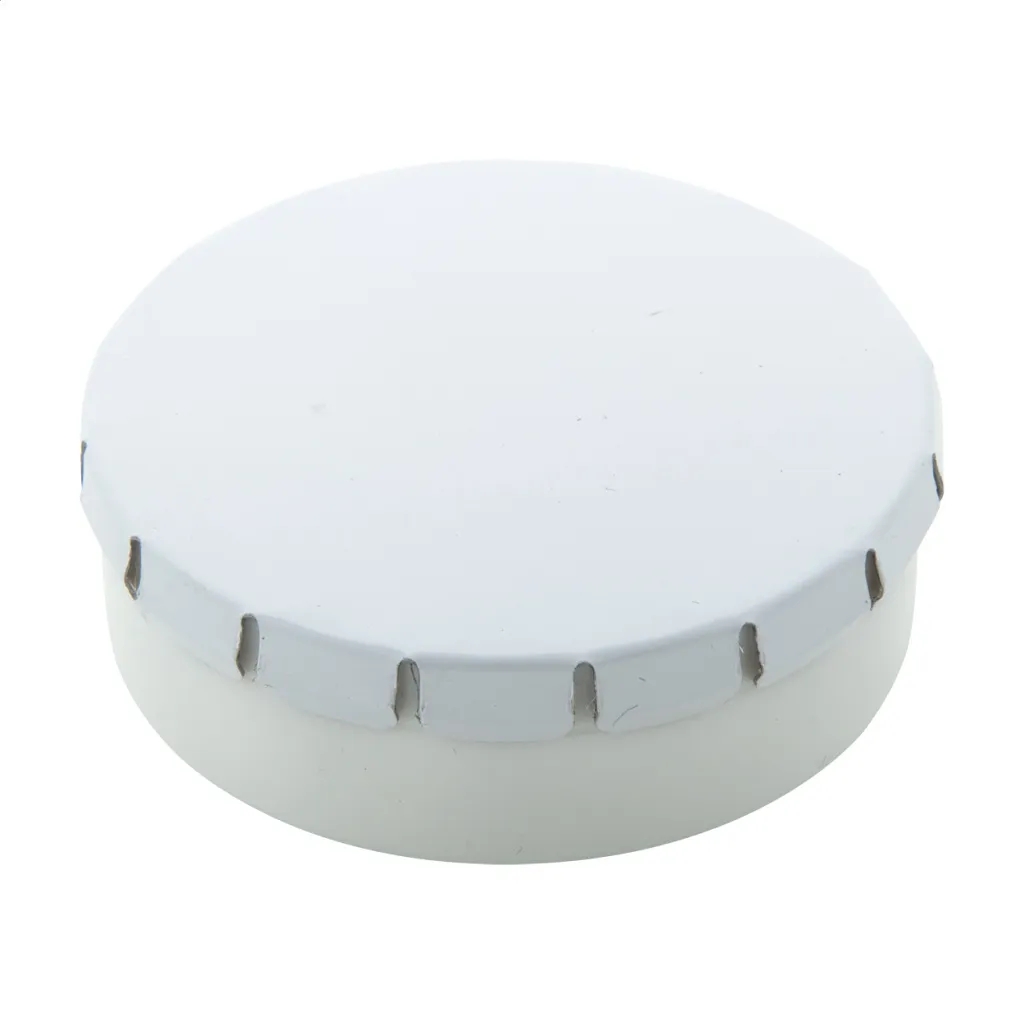 Mint candies in round plastic container with coloured, easy-open tin cover. Containing 12 grams of sugar-free mint candies.