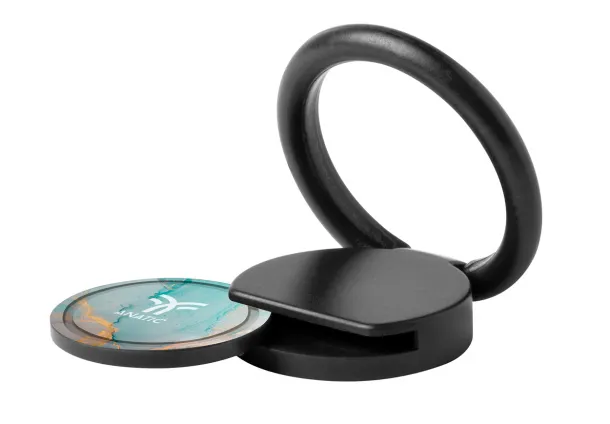 Round shaped, plastic mobile holder ring with self adhesive base and shopping trolley coin.