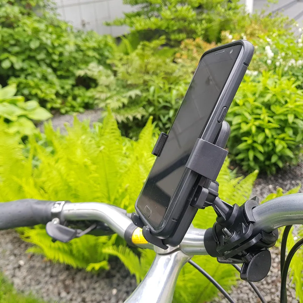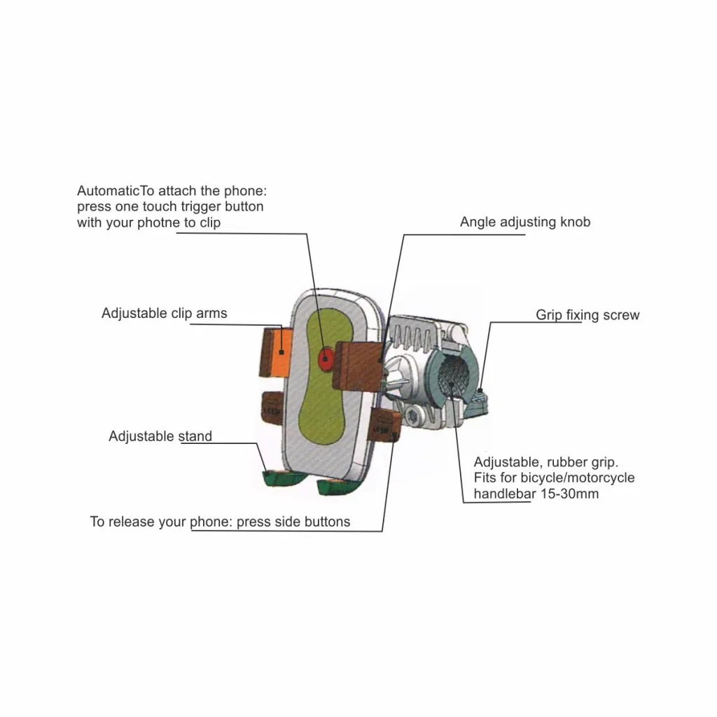 Mobile phone holder for bicycle made of plastic and rubber for mobile phones with a width of 5.5 - 8.5 cm. Adjustable tilt. Thanks to the mounting method, you can only fix or unlock the phone with one hand.