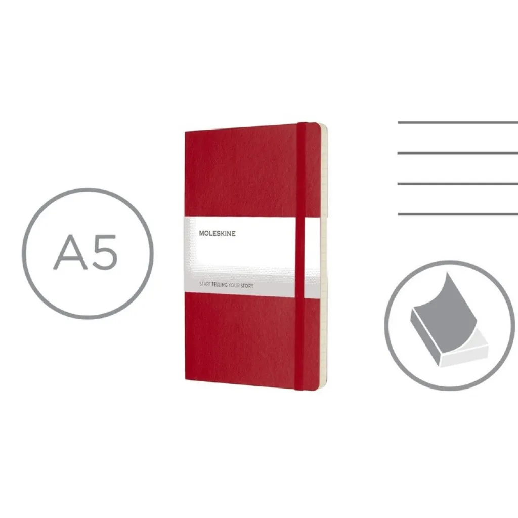MOLESKINE notebook (approx. A5, large), 192 lined pages, soft cover, inner pocket, ribbon marker and elastic band for closing