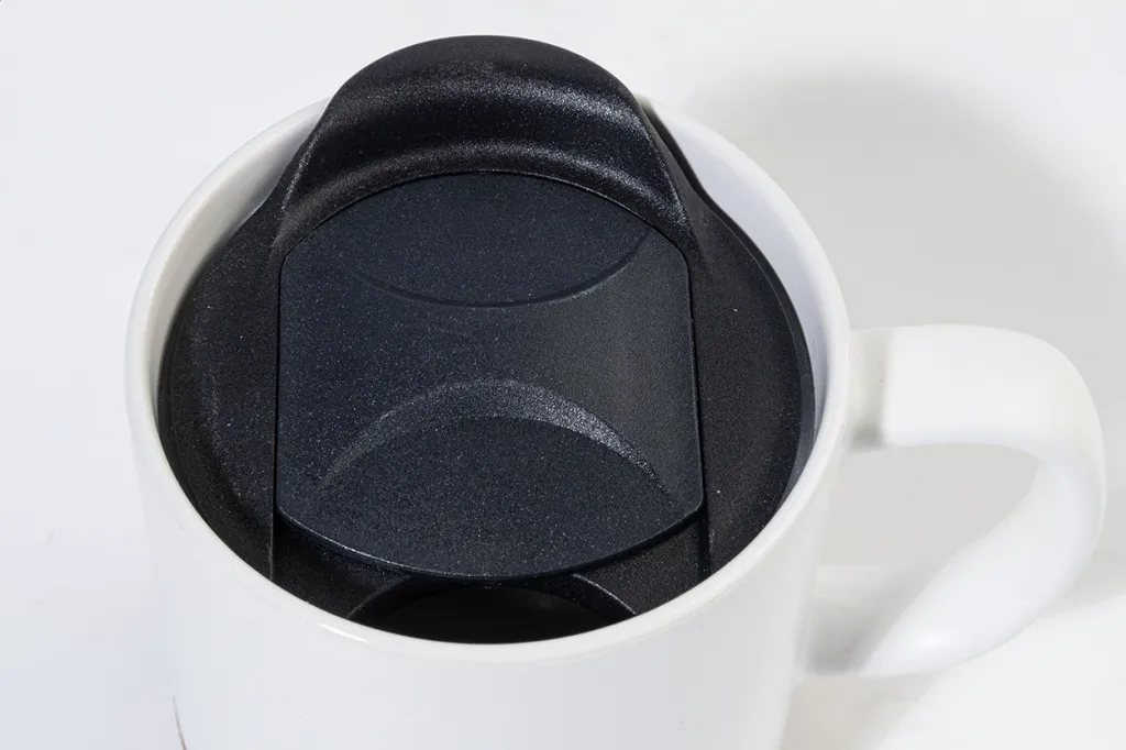 High quality ceramic mug with natural cork base and PP plastic drinking lid. With matte outside and glossy inside finish. 325 ml. In kraft paper box.