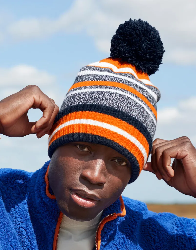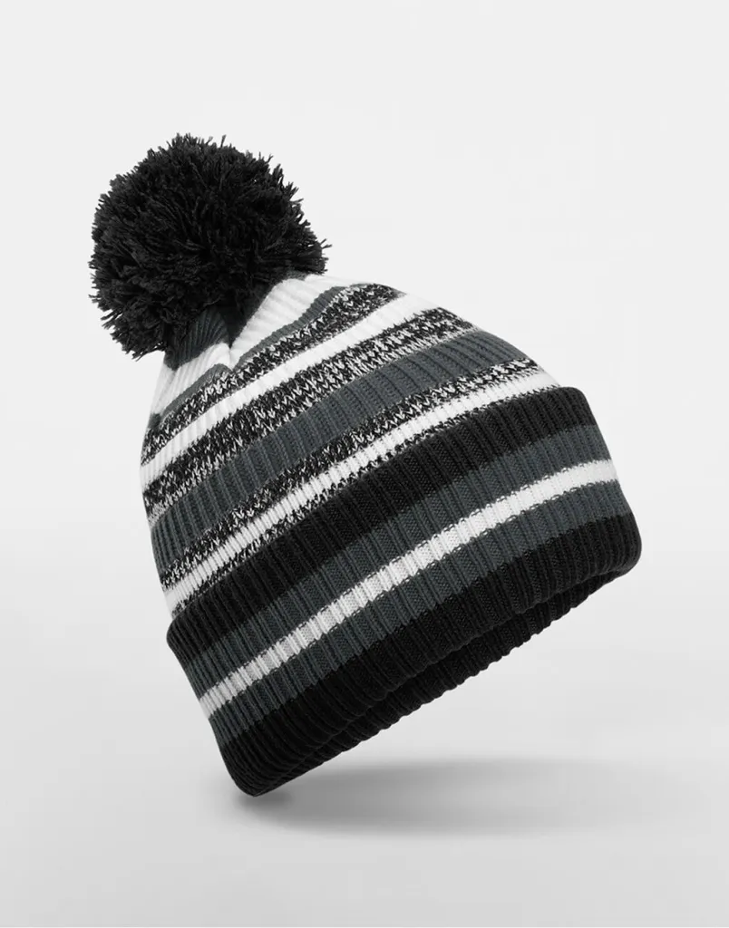 ·100% Recycled Polyester ·Sport colour combinations ·Oversized fold over cuff ·Multi stripe design ·Double layer knit ·Self-coloured pom pom ·Microfleece lining for comfort and warmth ·Cuffed design for optimal decoration