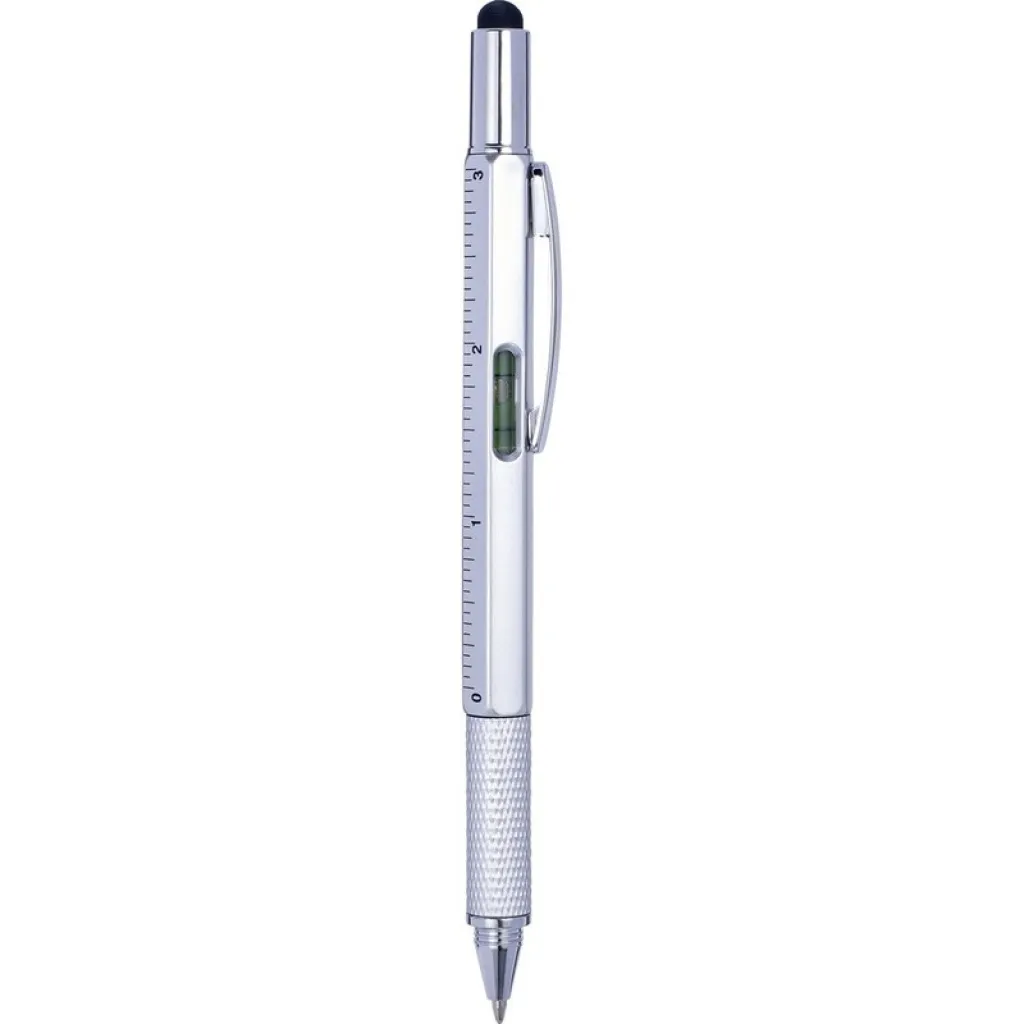 Multifunctional twist action ball pen, touch pen, ruler, spirit level