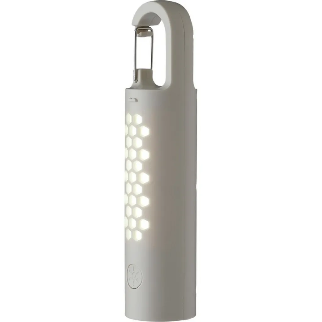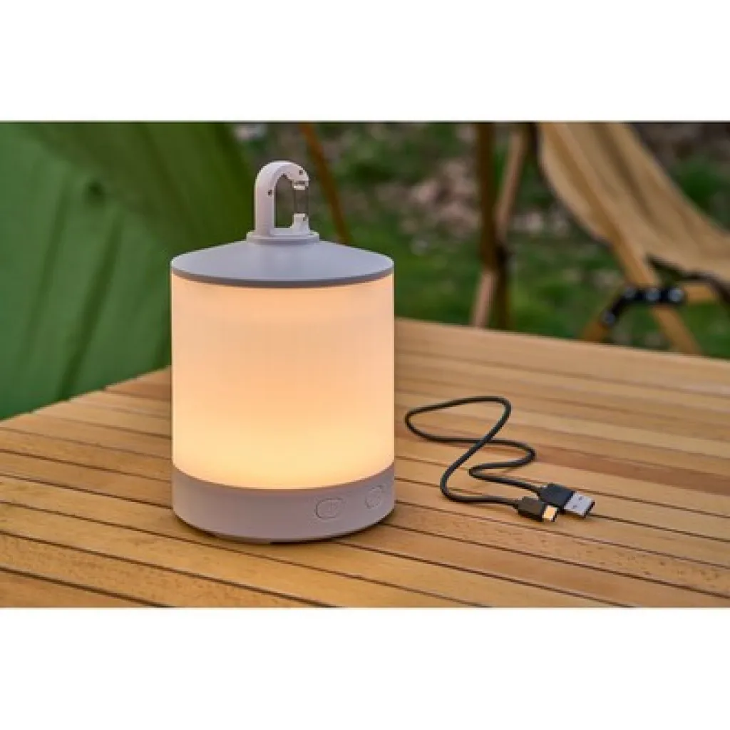 Multifunctional camping light with RGB function, detachable flashlight featuring a carabiner hook and 4 light functions, offers 8 colours, with white having 2 light modes, the other 7 colours can be set to a changing colour mode by holding the button, the flashlight has an 800 mAh battery, the camping light has a 2,400 mAh battery, includes type-C charging, individually packaged in a cardboard box, product made from ABS