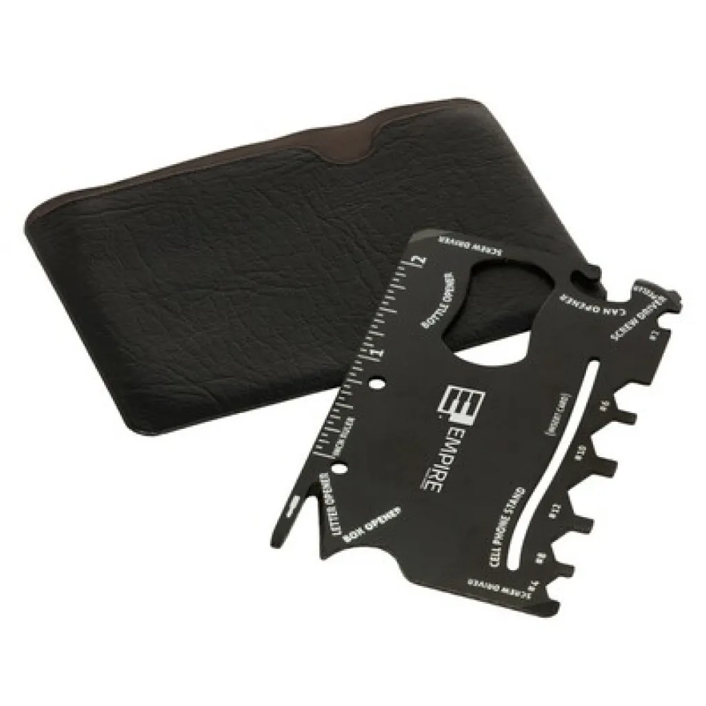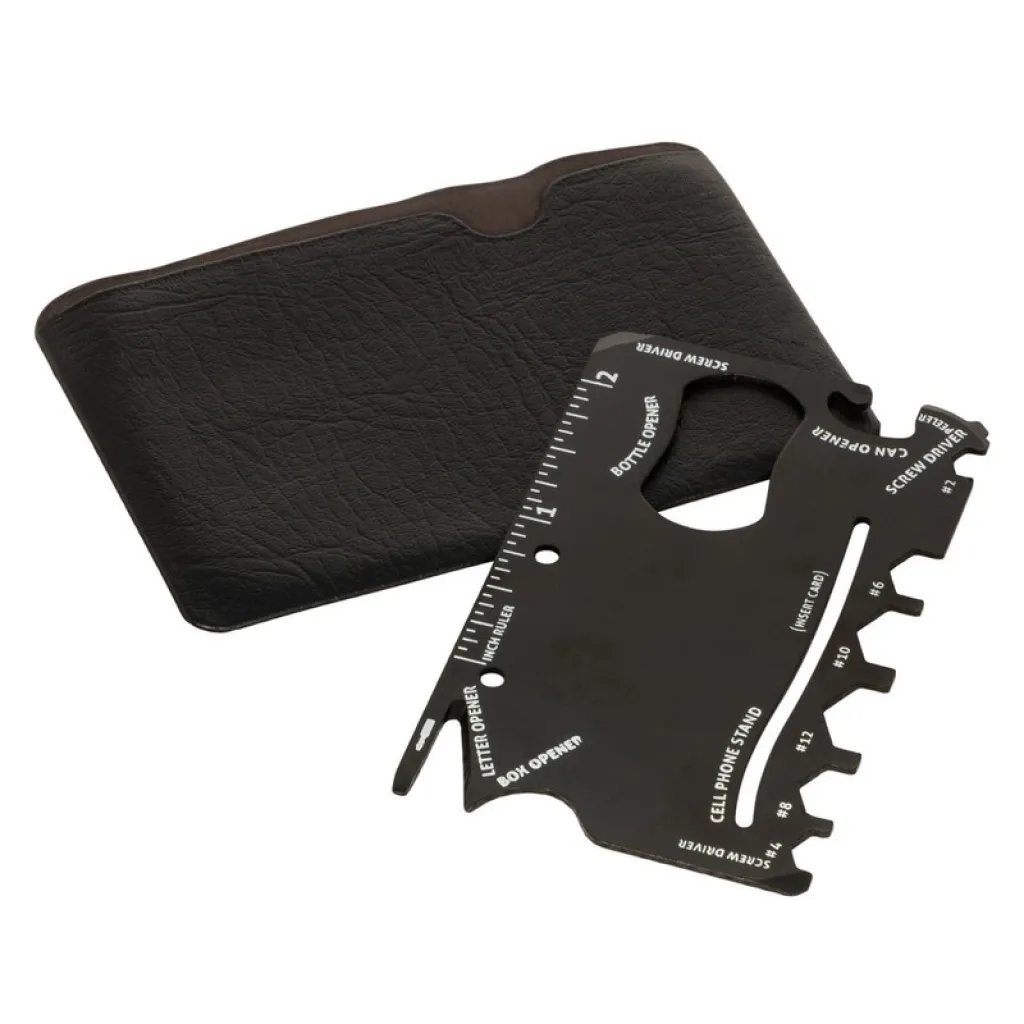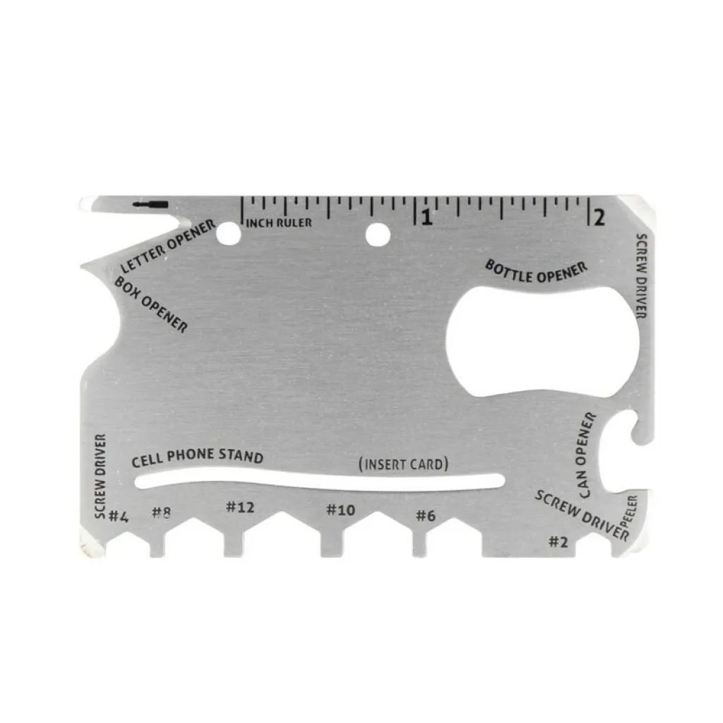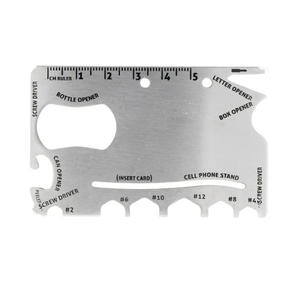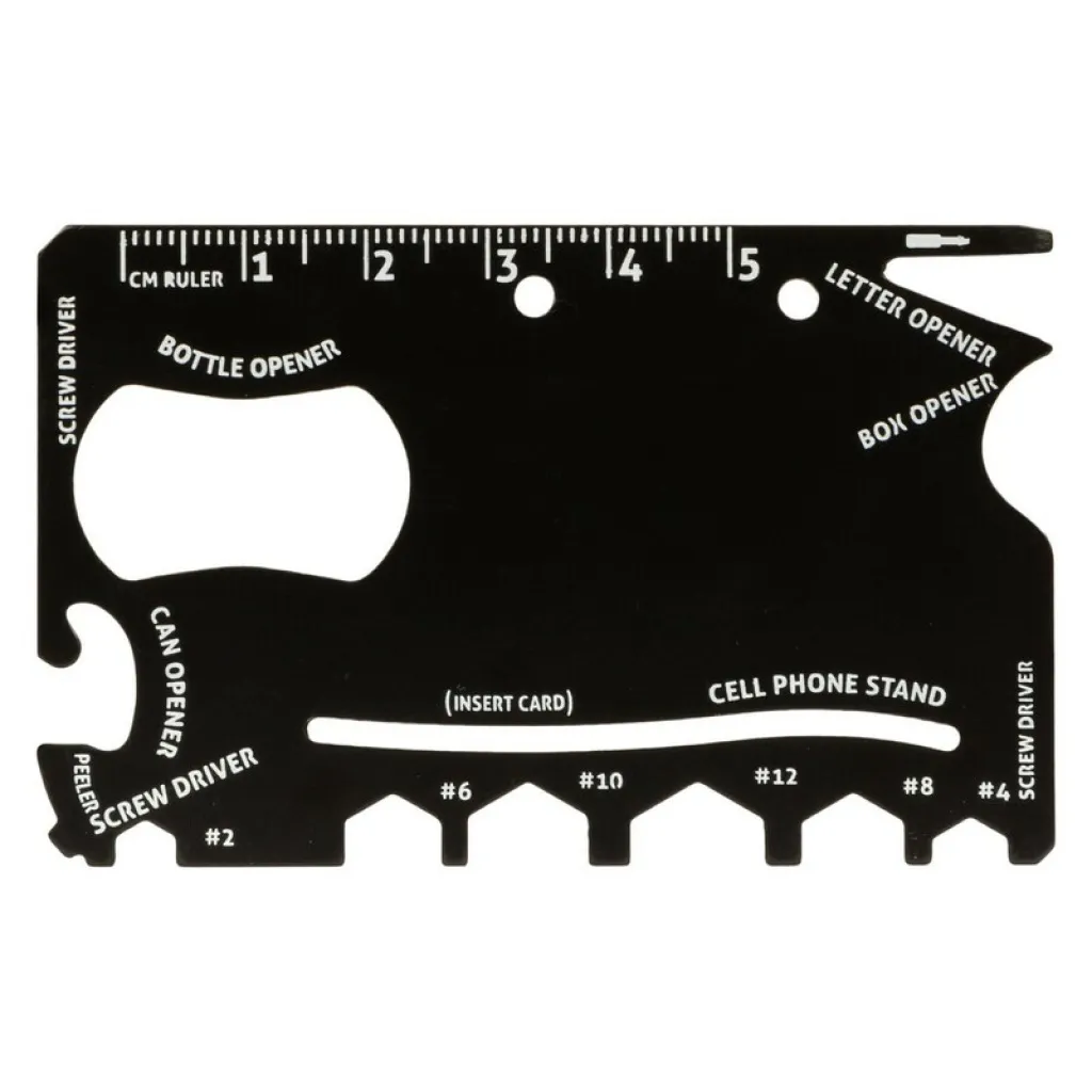 Multifunctional tool in case, 9 functions: ruler, mini screwdriver, box opener, 2x screwdriver, open hex wrench (#2, #4, #6, #8, #10, #12), phone stand (card not included), can opener, bottle opener