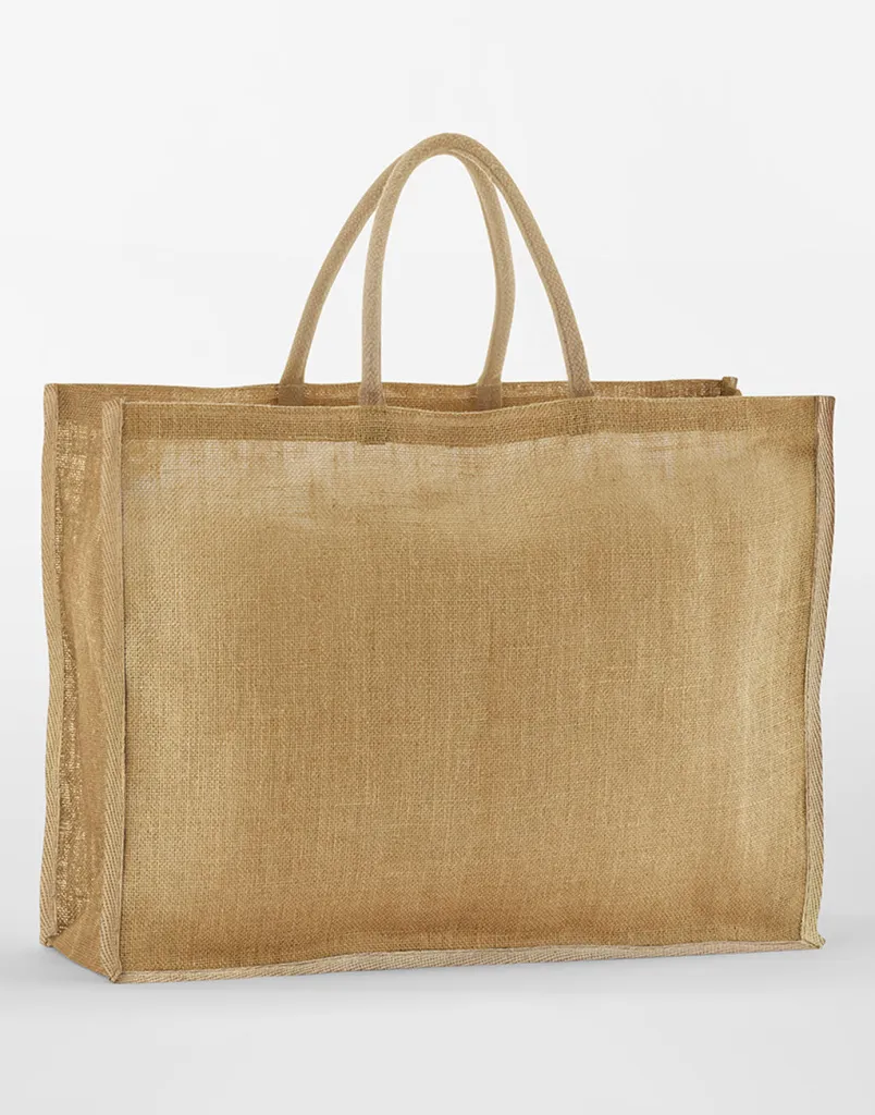 ·100% Jute (Unlaminated and Starched) ·Cotton carry handles (length: 47.5 cm) ·Can be carried by hand or over the shoulder ·CutAway label for ease of rebranding ·Extra large Capacitiy ·Capacity: 46 Litres ·Dimensions: 42.5 x 55.5 x 21 cm ·Max. embroidery: 36 x 30 cm ·Max. print area: 50 x 36 cm.