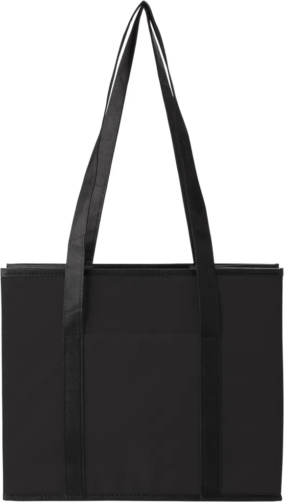 Nonwoven (80 gr/m²) foldable car organizer with two long carry handles, two carry handles, a front pocket, and a matching cardboard bottom.