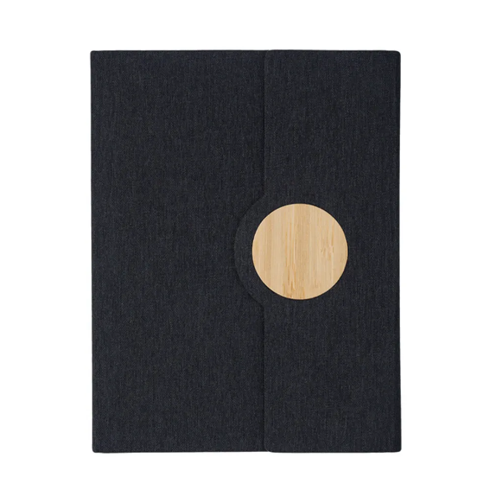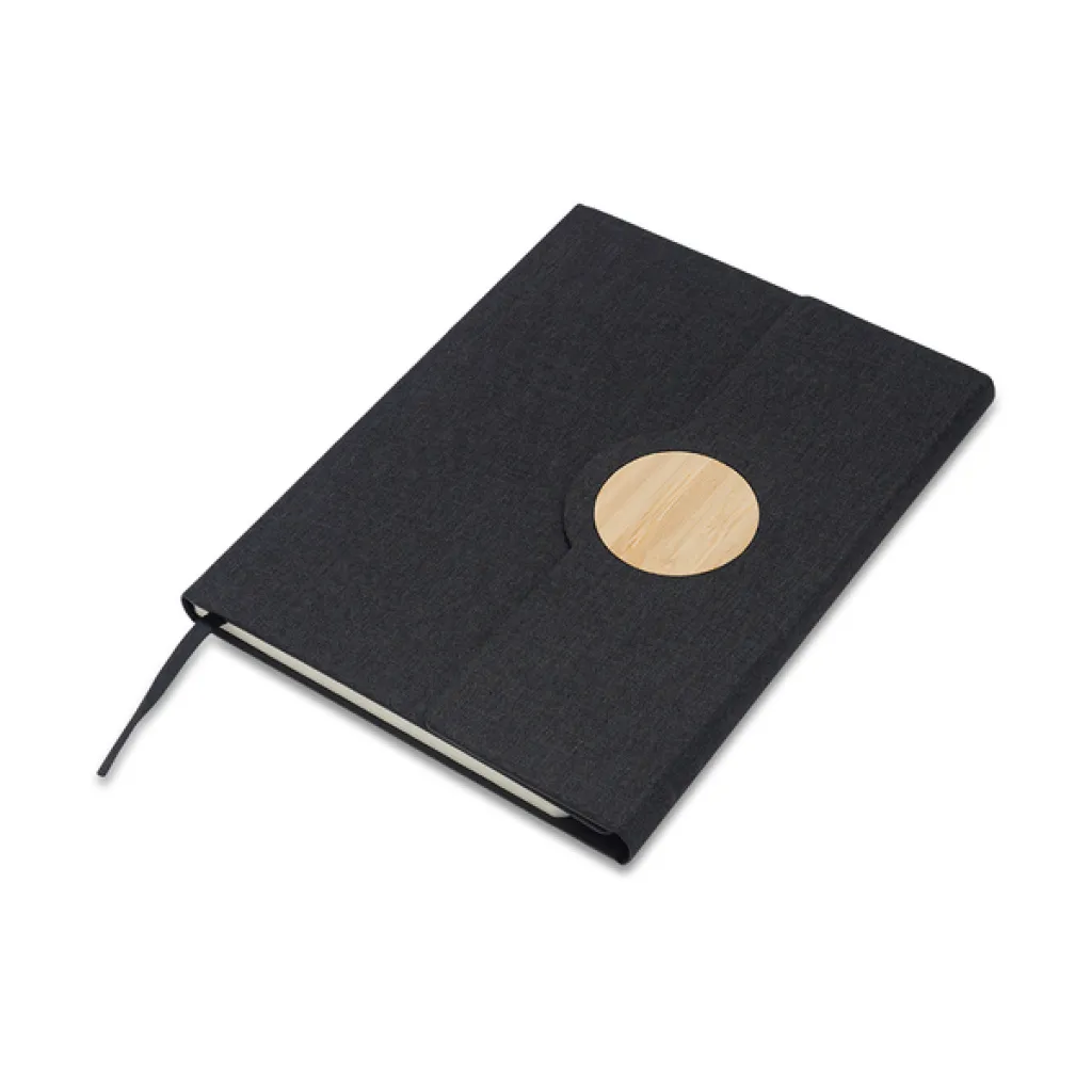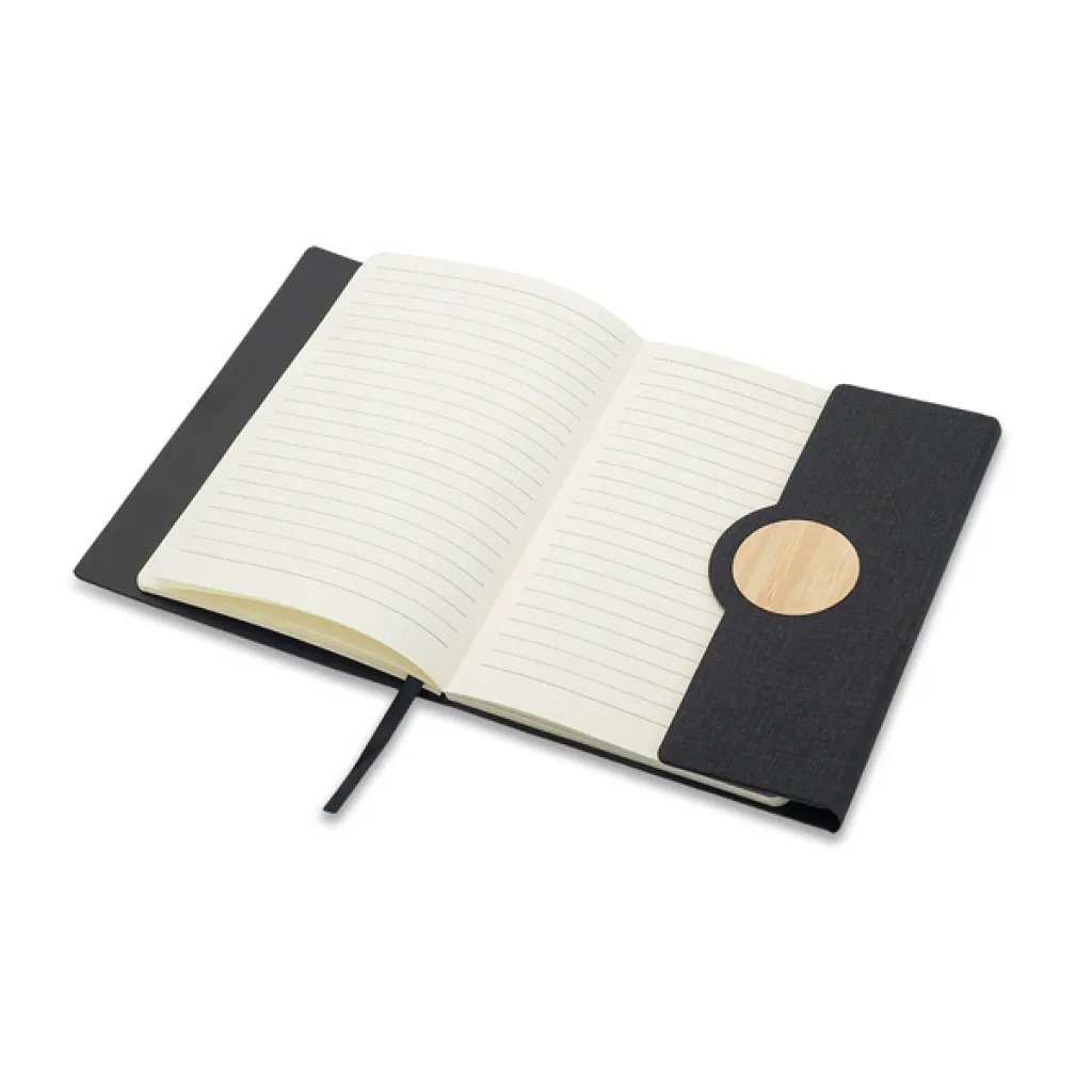 Elegant notebook with lined pages ( 80sheets 70 gsm) in a hardcover made of RPET fabric, decorated with a bamboo element. It has a pen holder. Closed with magnetic clasp.