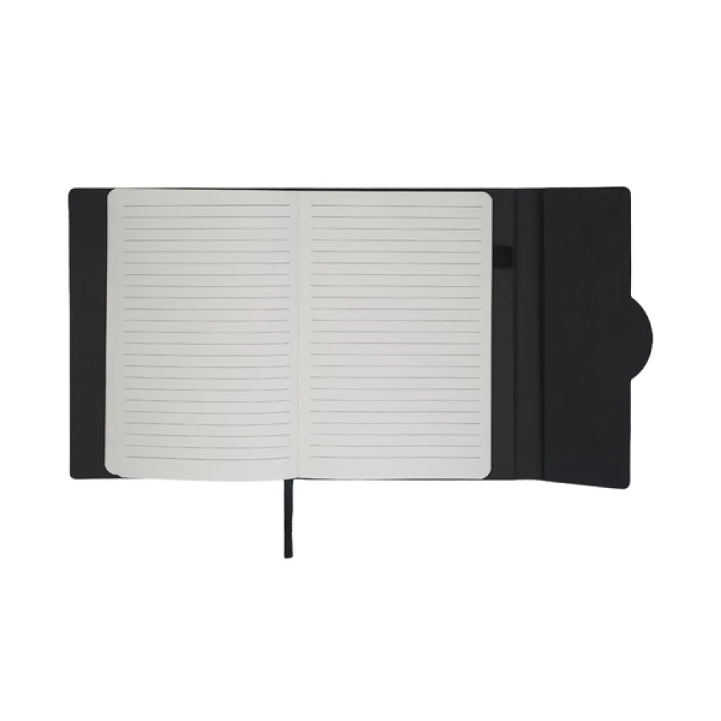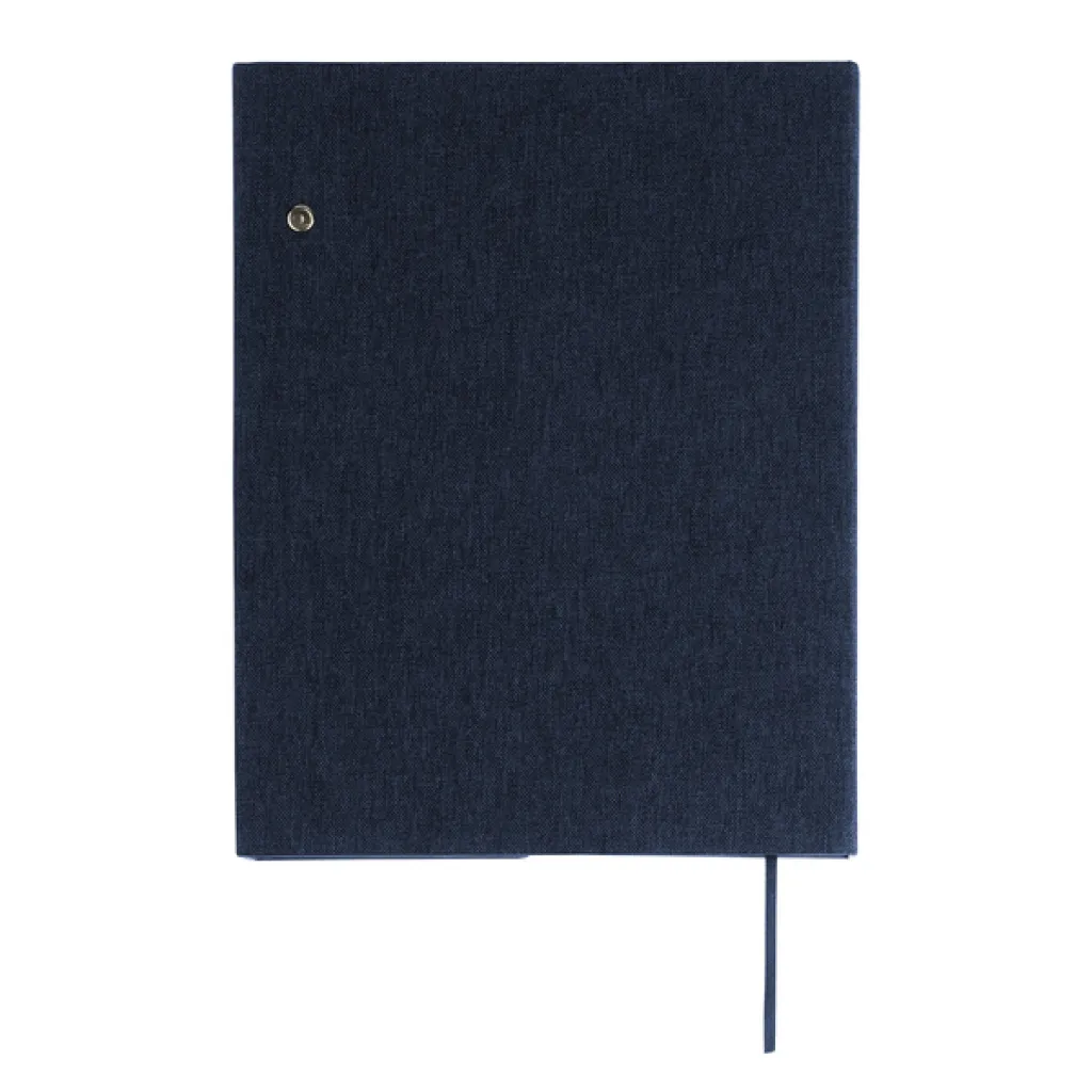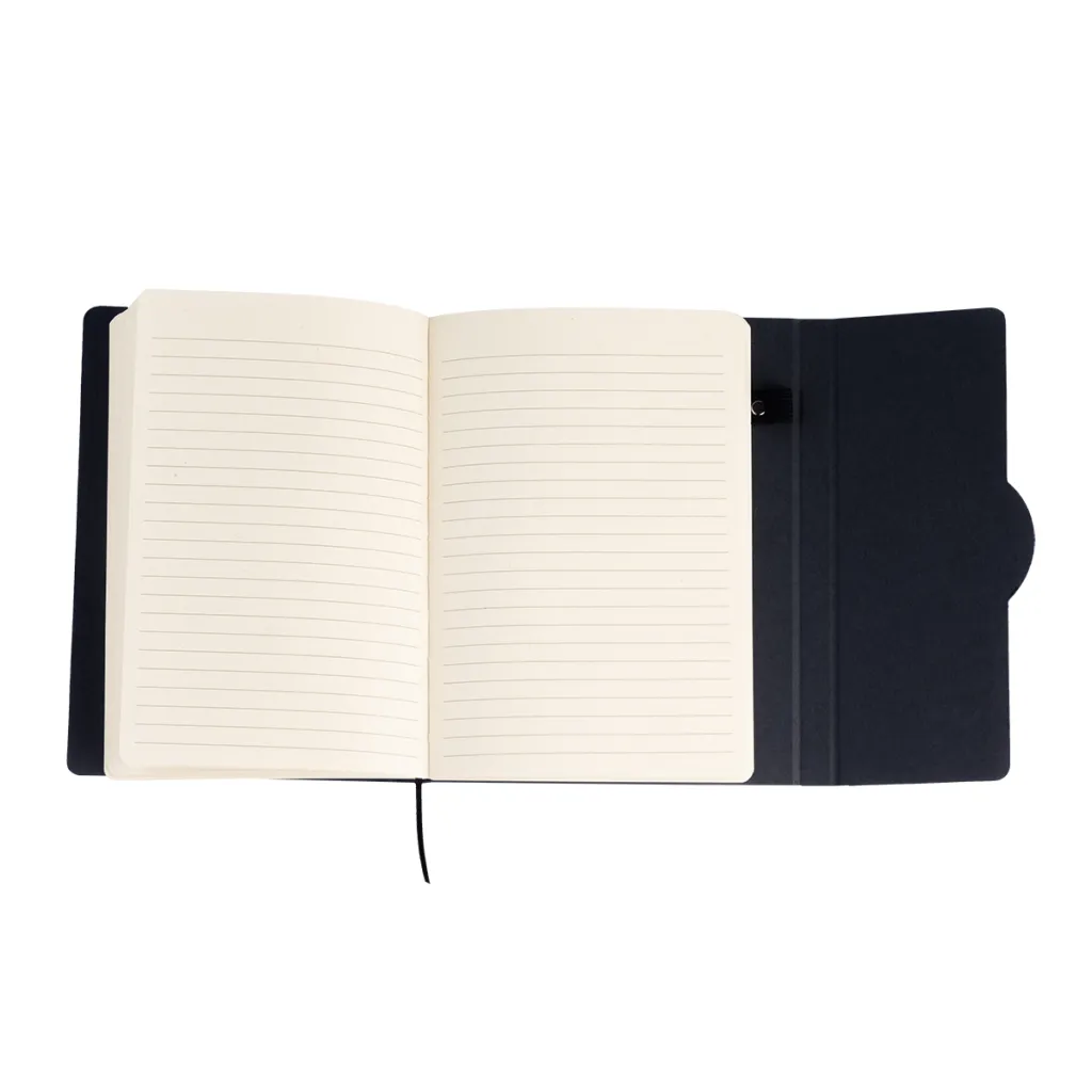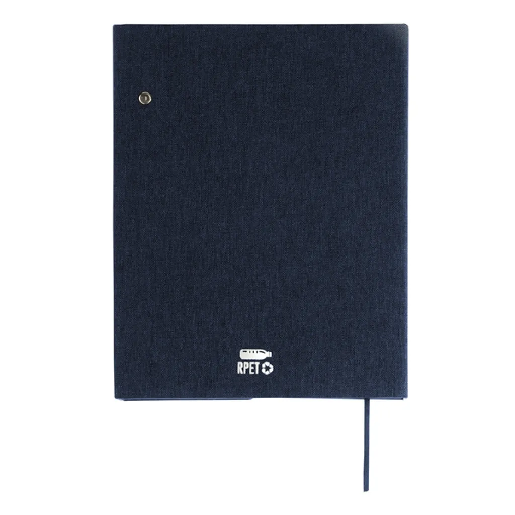 Elegant notebook with lined pages ( 80sheets 70 gsm) in a hardcover made of RPET fabric, decorated with a bamboo element. It has a pen holder. Closed with magnetic clasp.