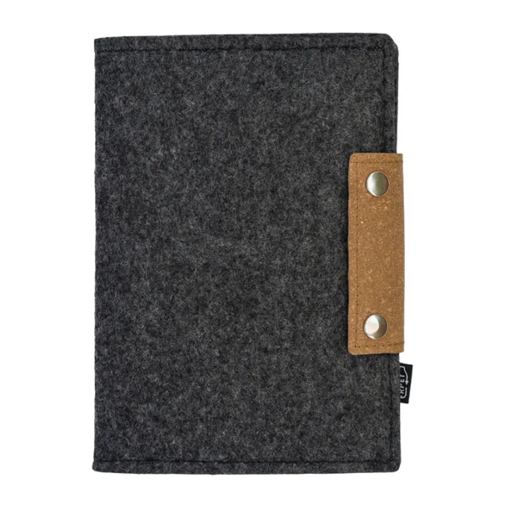 A5 RPET-Felt cover notebook/organizer with recycled leather closure. Inside the cover there are pockets, e.g. for phone, pen and business cards. Replaceable lined A5 notebook (80 sheets 70 gsm).