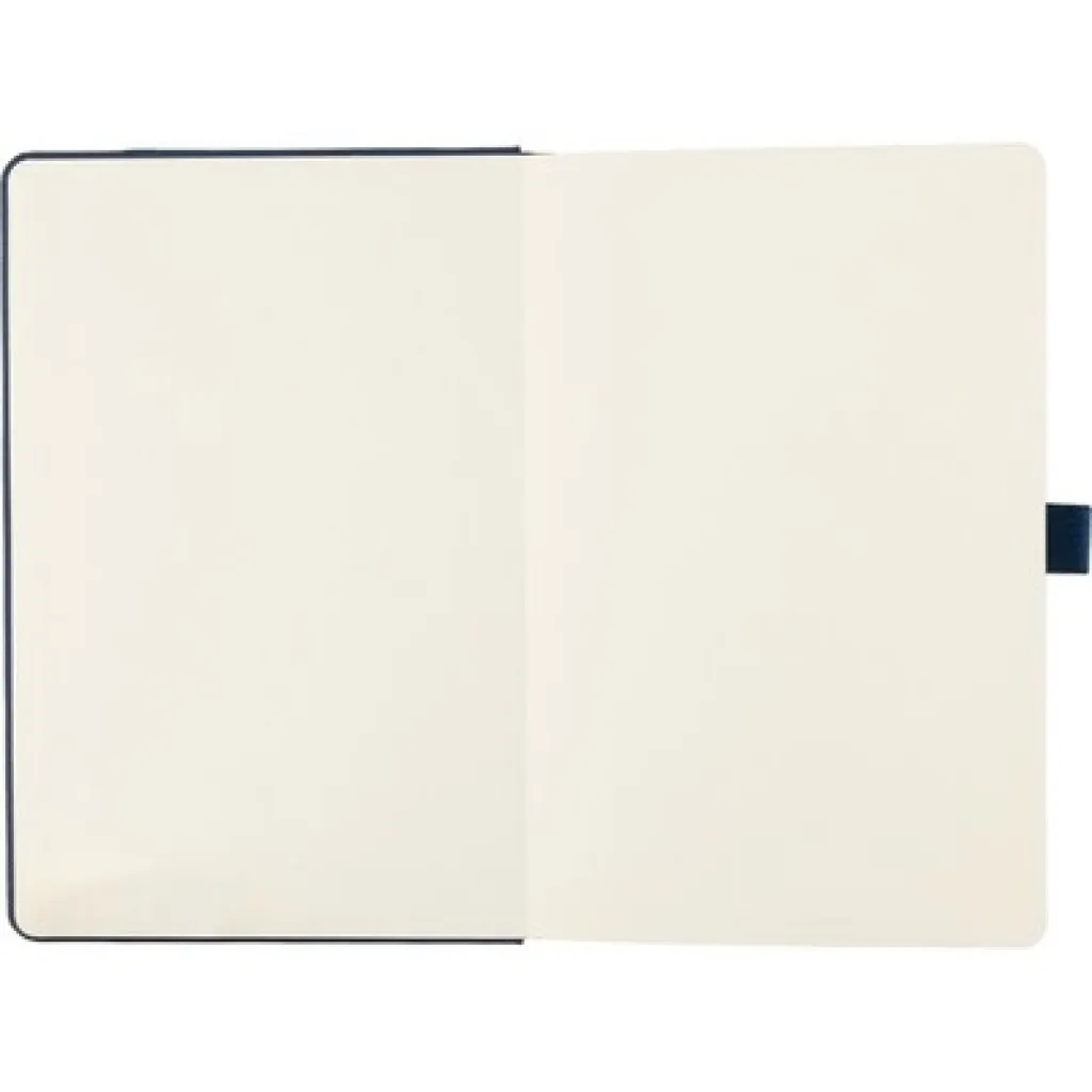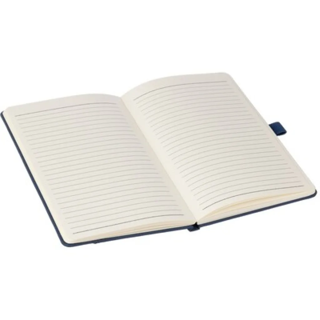 Notebook A5 size with 100 lined pages, fits inside of a school backpack, individually packaged in tissue paper, product made from RPET.