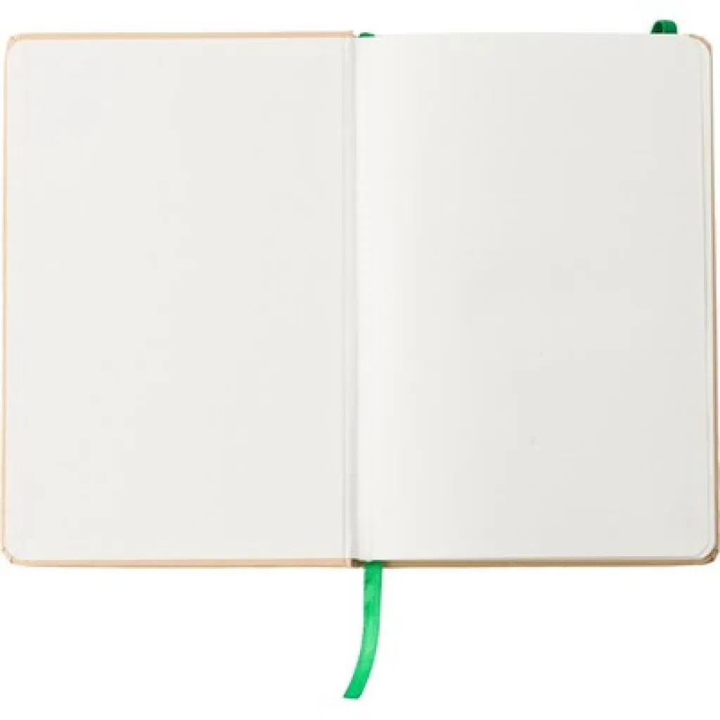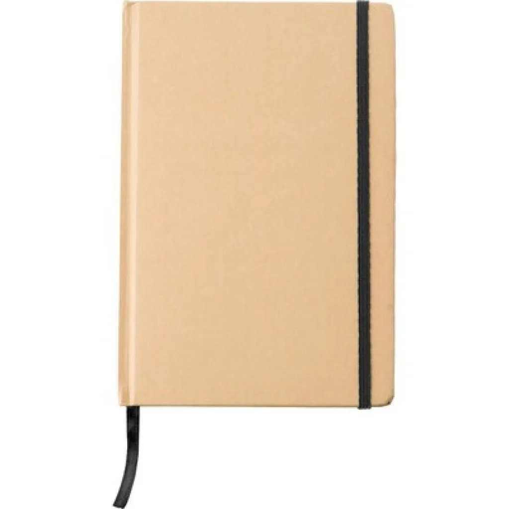 Notebook (approx. A5, 80 lined sheets), made of recycled cardboard, ribbon marker and elastic band for closing