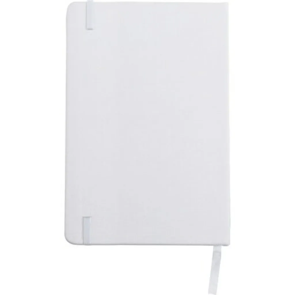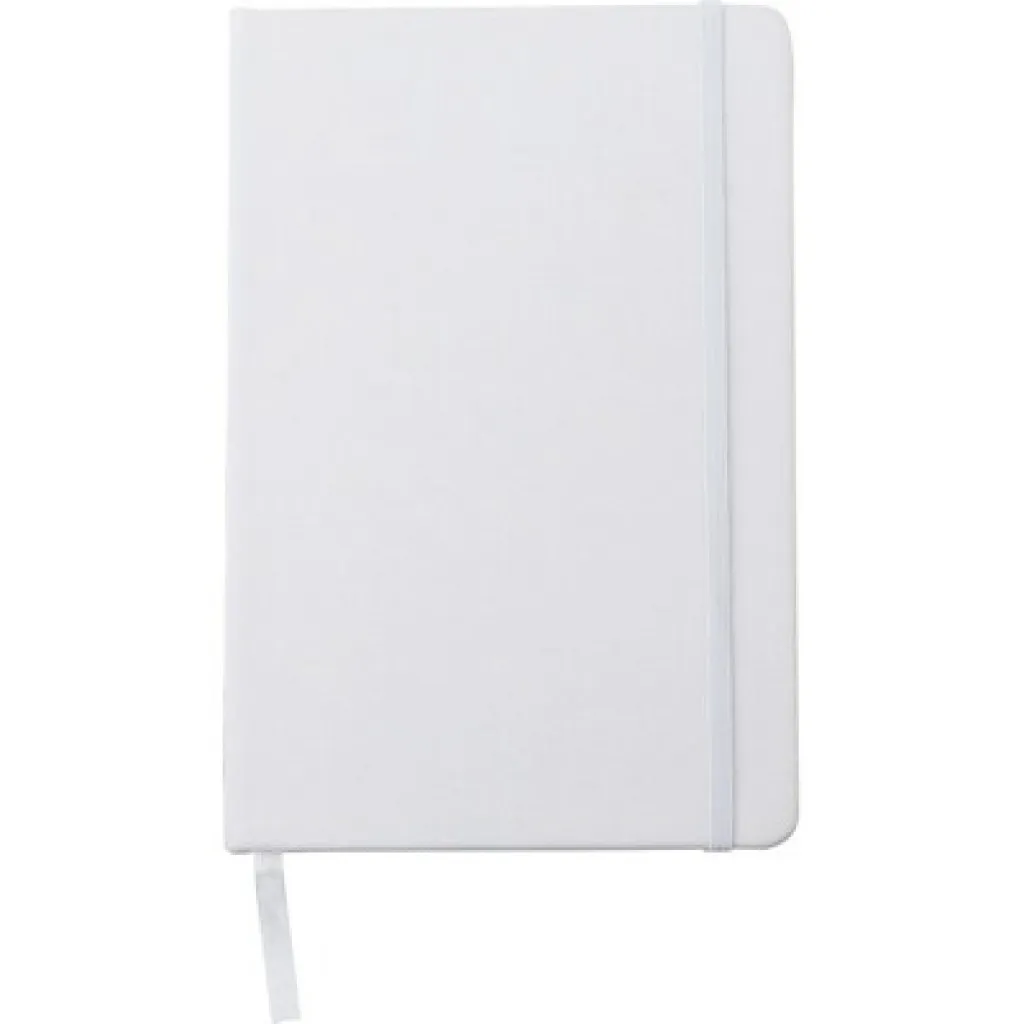RPET notebook (approx. A5, 80 lined sheets), ribbon marker and elastic band for closing