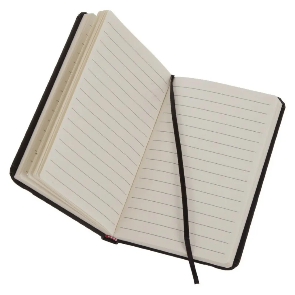 Notebook (approx. A6, 96 lined sheets), elastic band for closing and ribbon marker