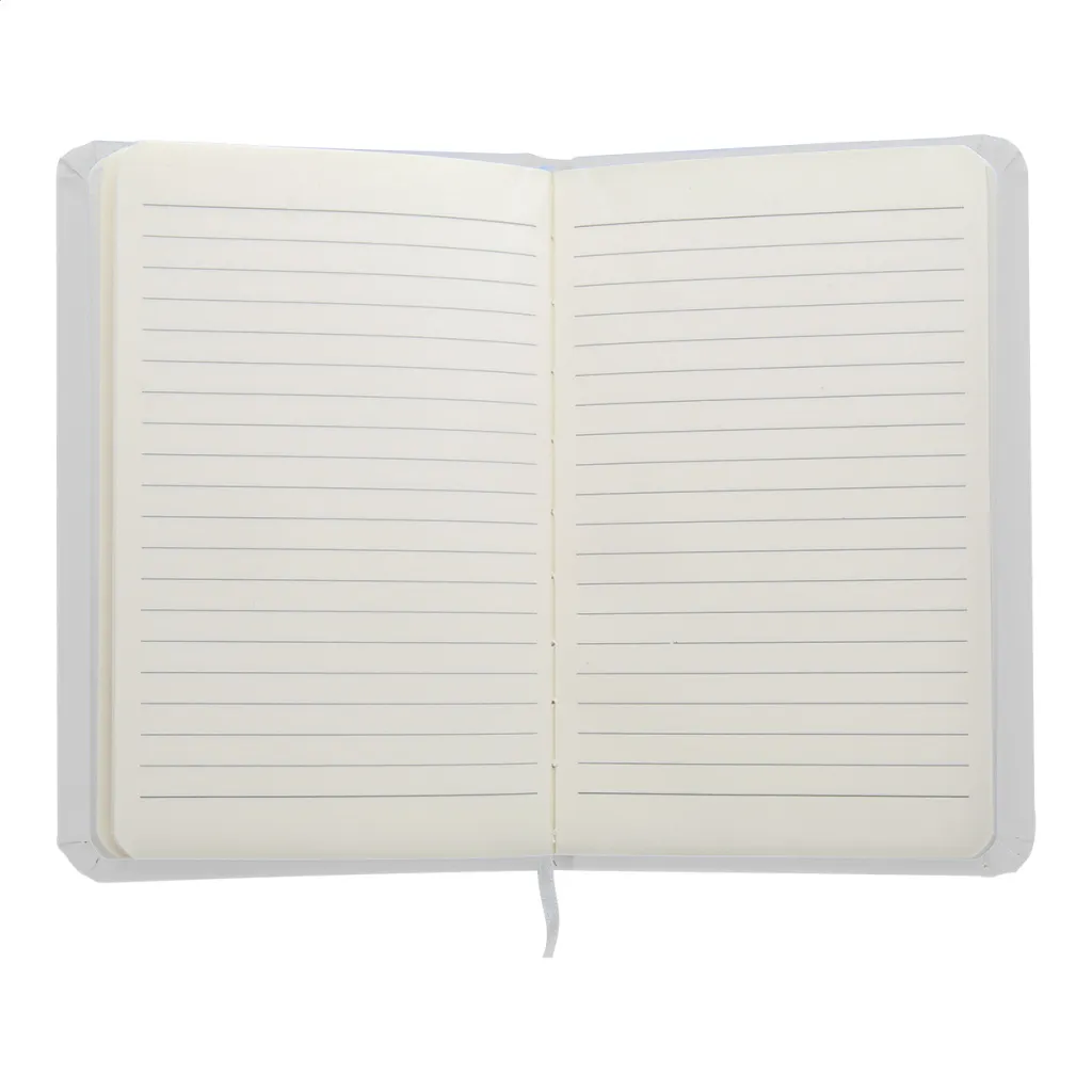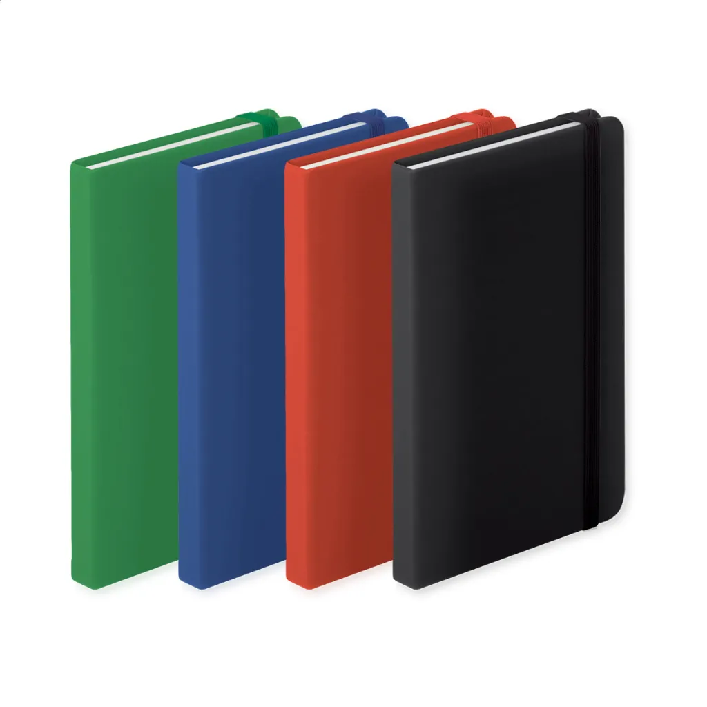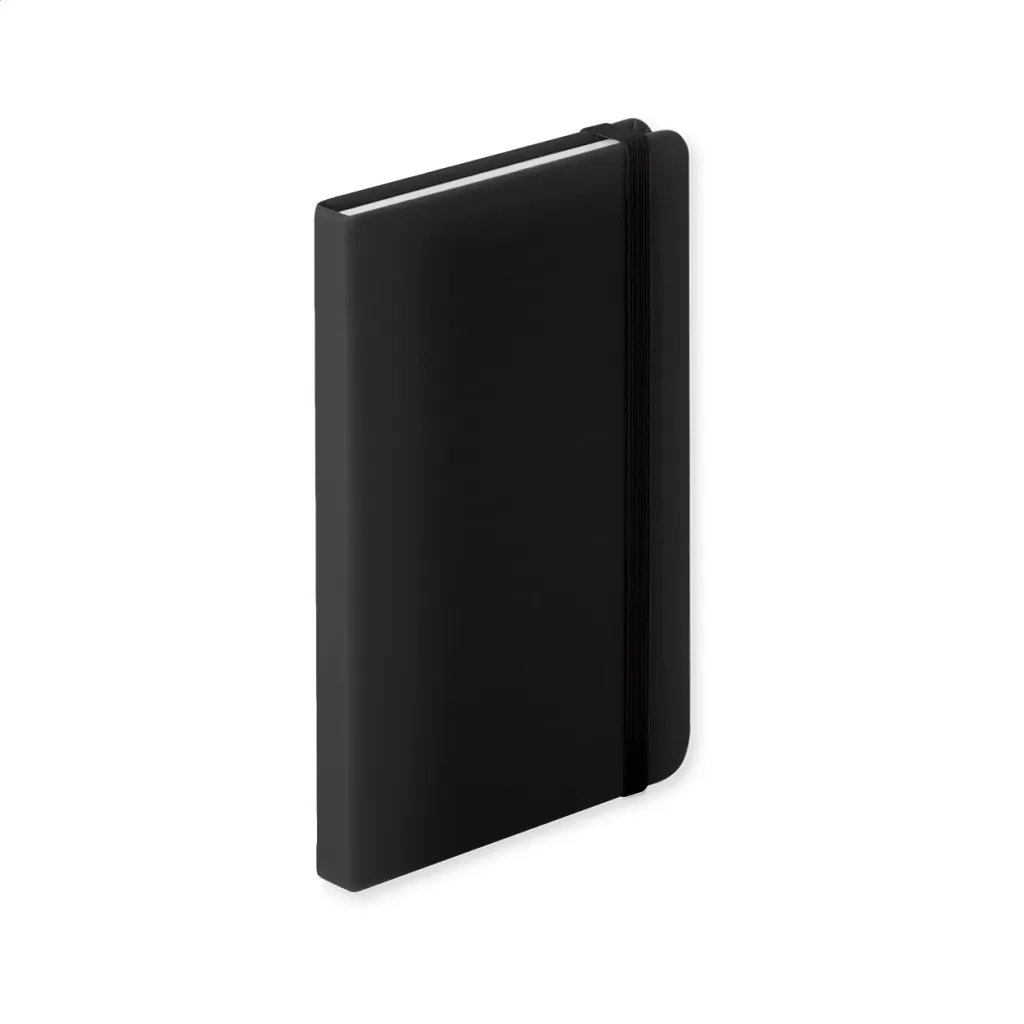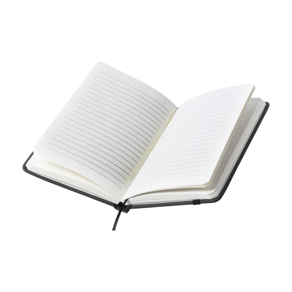 PU leather covered notebook with 100 lined sheets, bookmark and rubber strap.