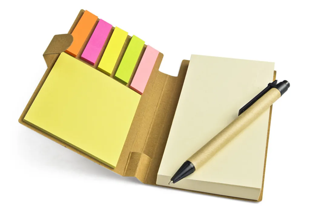 Notebook with memo sheets and the ball pen. It has a cardboard frame. Environmental-friendly ball pen made of both cardboard and recycled plastic. Logo can be pad printed on the notebook.