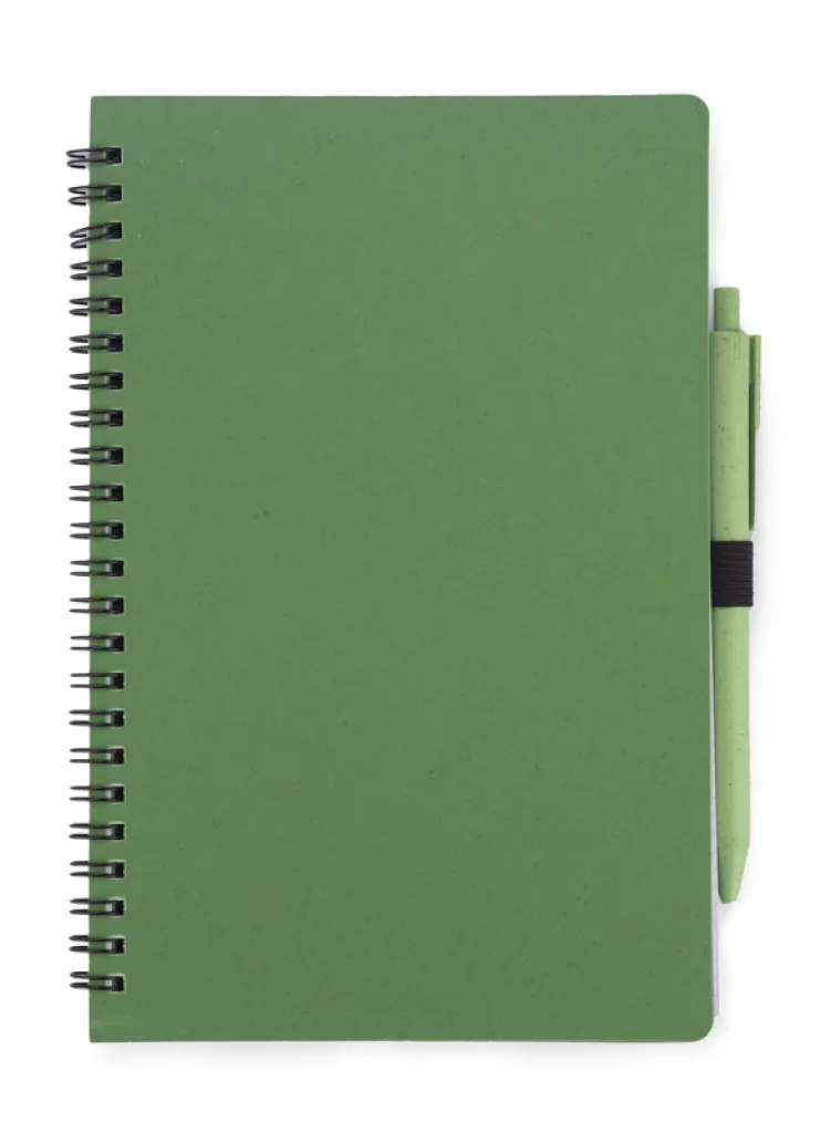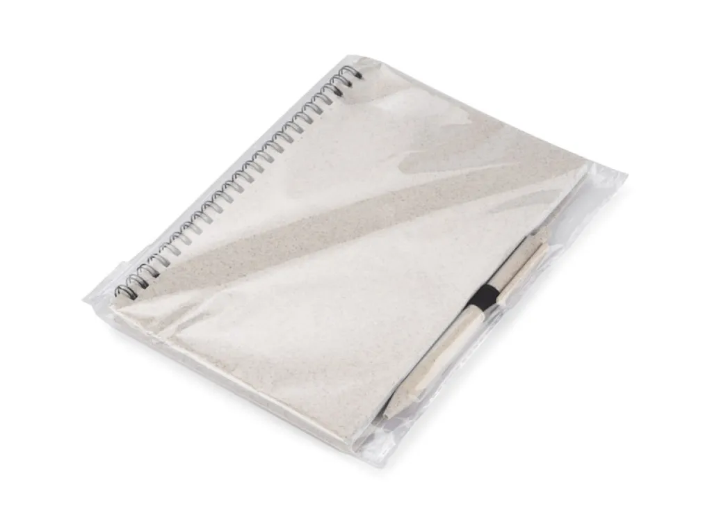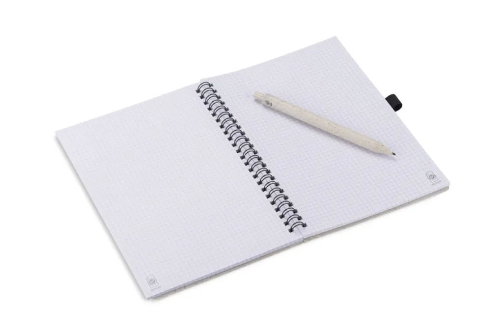 TRESA notebook with a pen, colour-matched to the cover. The pen and cover of the notebook are made from wheat straw. Spiral-bound notebook with 70 sheets of checked, recycled paper. Format A5. Ballpoint pen refill in blue.