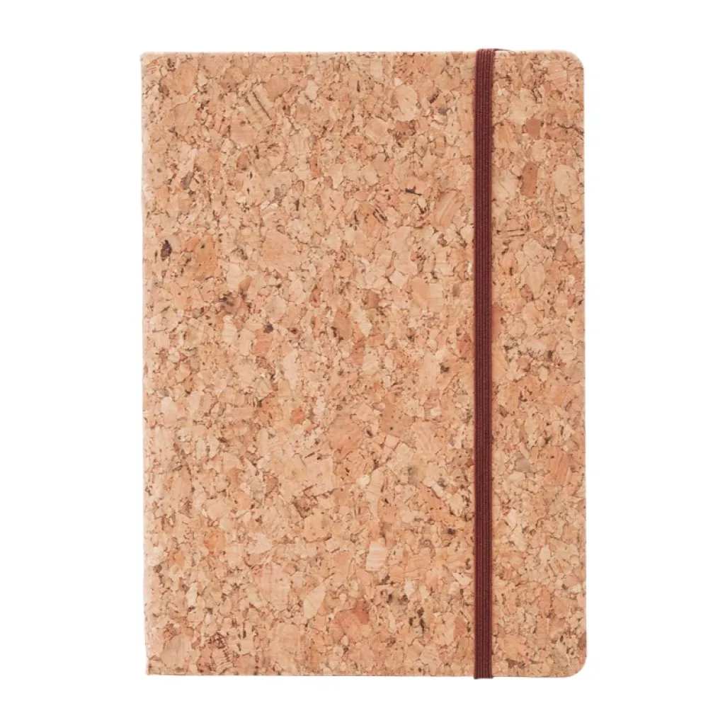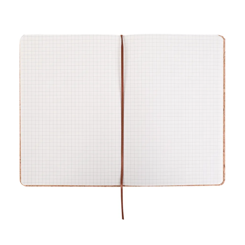 A5 Notebook with Smooth Cork Cover. Elastic closing on the tape. Squared suede cream paper (70 g / m2, 160 pages).