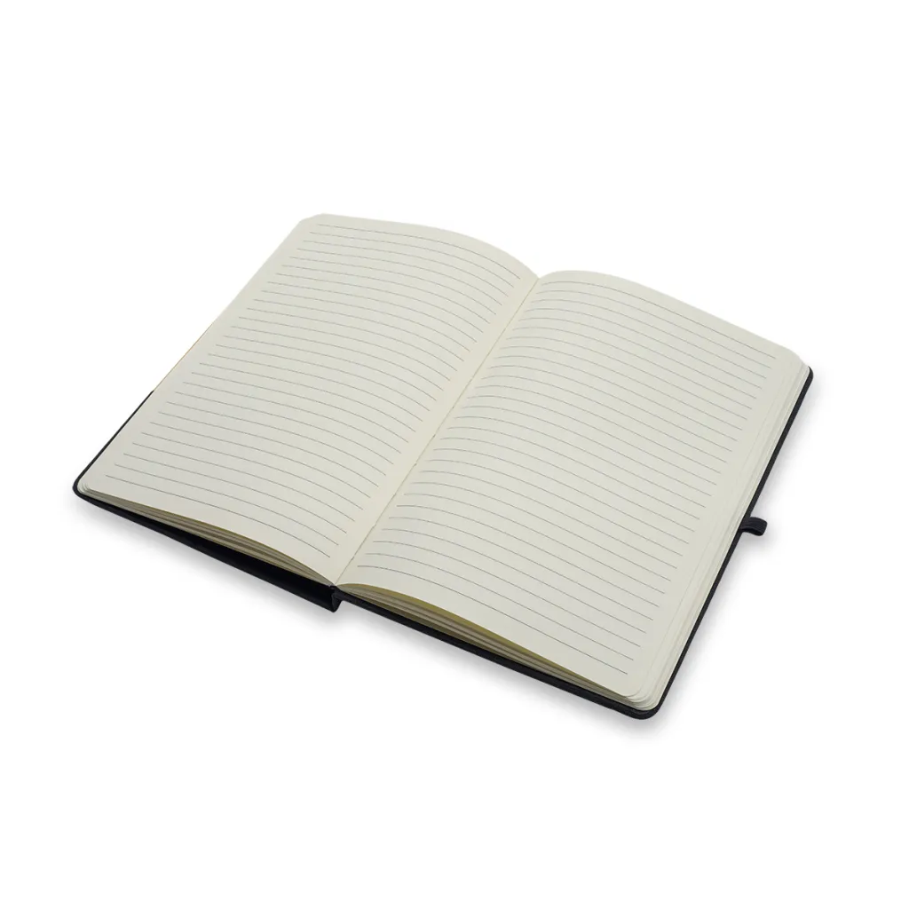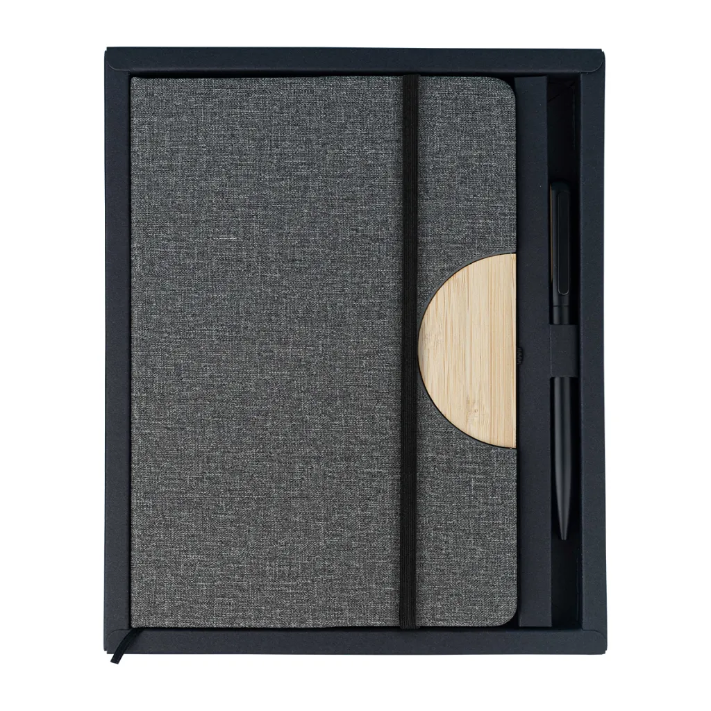 Set consisting of a notebook and a pen with bamboo trim. The hardcover of the notebook can be turned into a phone stand. 80 sheets with lined paper (70 g/m2), a ribbon for marking pages and an elastic band closure. Aluminum ball pen with a matte finish (blue refill). Packed in a black gift box.