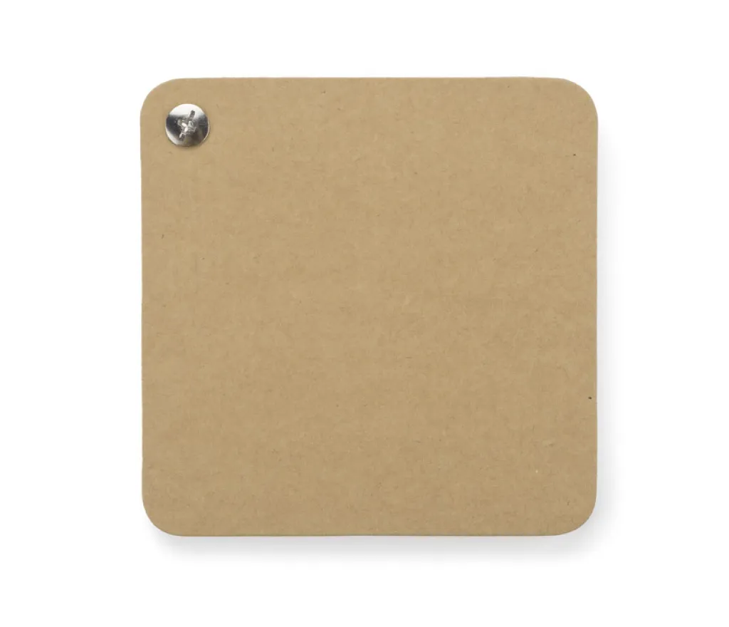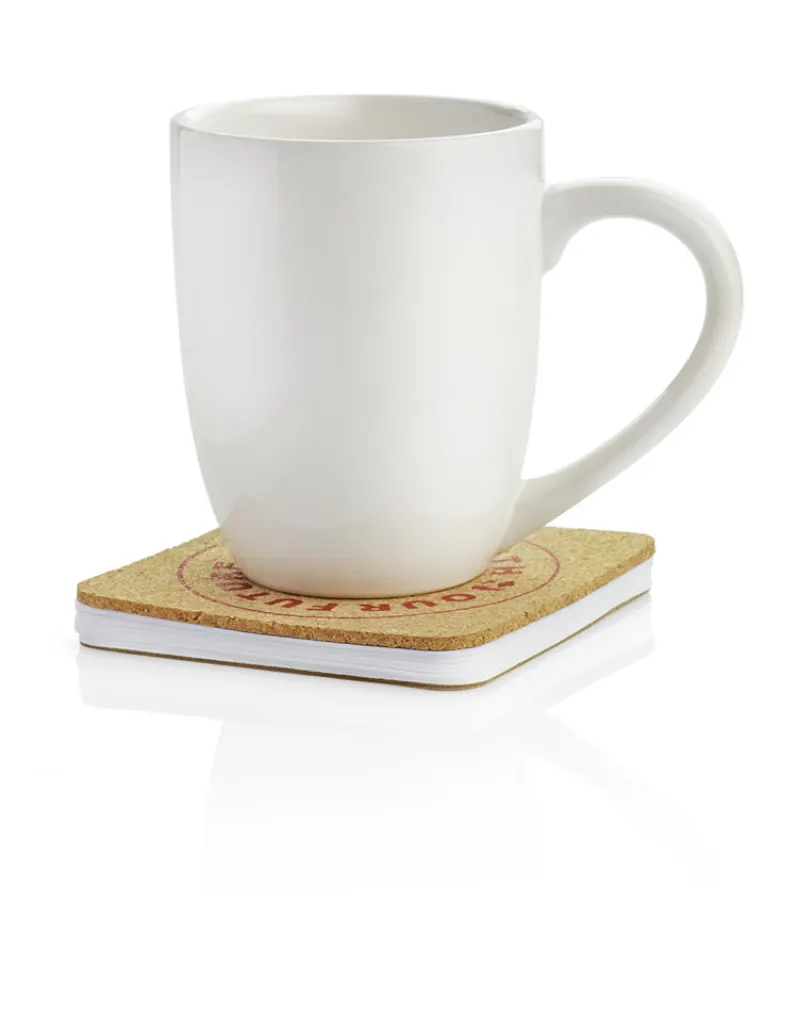 A notebook containing 60 white sheets can also be used as a cork coaster. The logo can be printed on cork and cardbord surface.