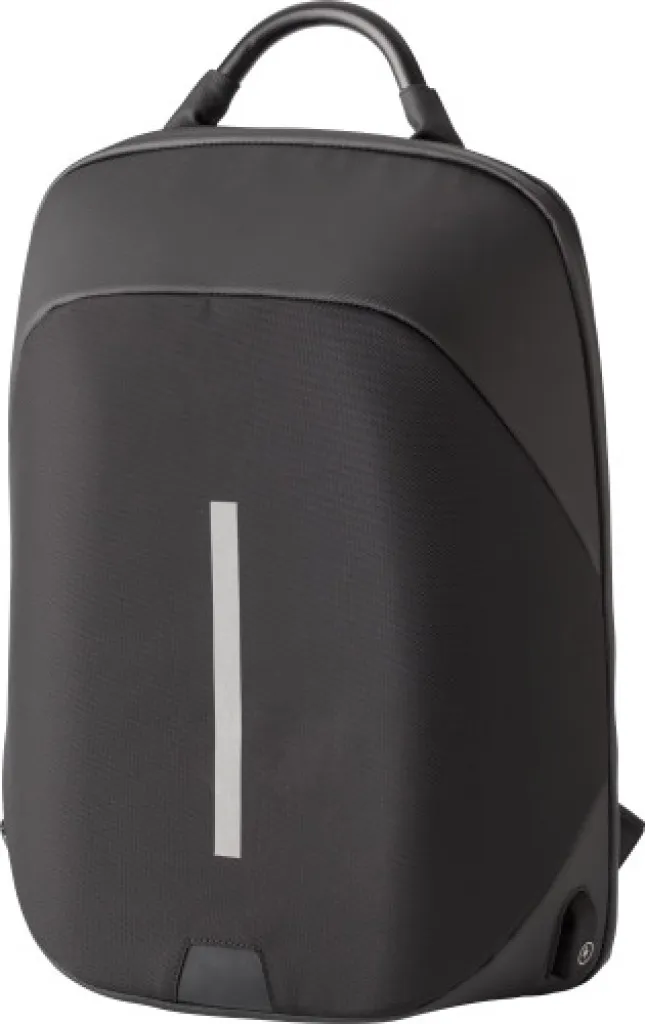 Nylon (1200D) backpack with interior pockets, including padded laptop compartment (15 inch). Padded back and padded and adjustable shoulder straps. Three-digit combination lock, USB port and cable, reflective stripe, and special weight reduction feature.