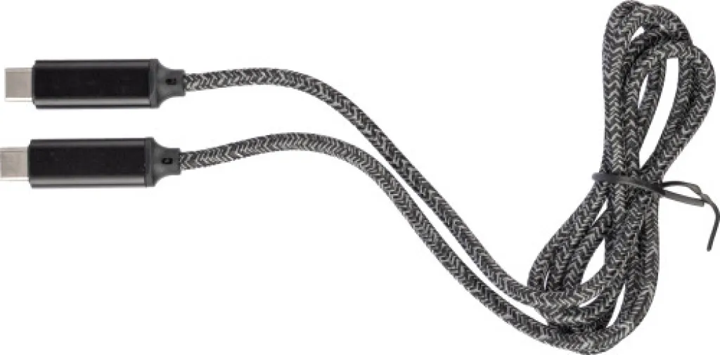 Nylon charging cable with aluminum sockets. Length: 1 meter. USB-C to USB-C. Capacity: 100 W. Blue charging speed indication light on one socket. Individually packaged in a brown carton box. Data transfer speed 480Mbps.