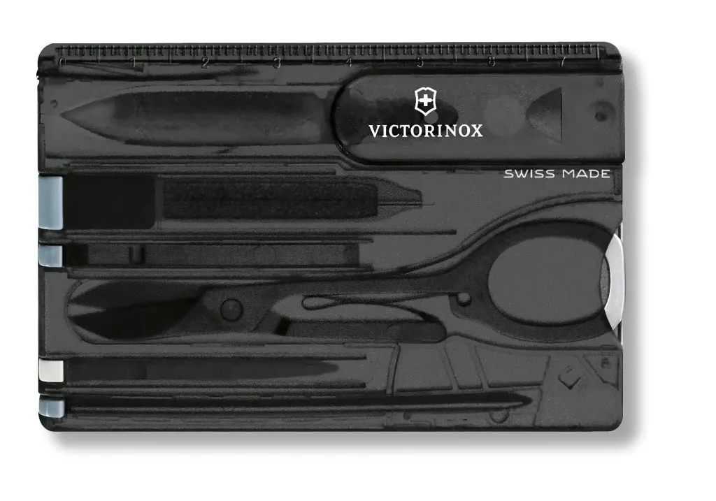 Nylon Victorinox SwissCard Classic multifunctional tool, including: letter opener, tweezers, scissors, nail file, toothpick, ballpen and steel pin. Individually packaged in giftbox.