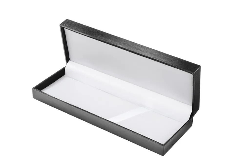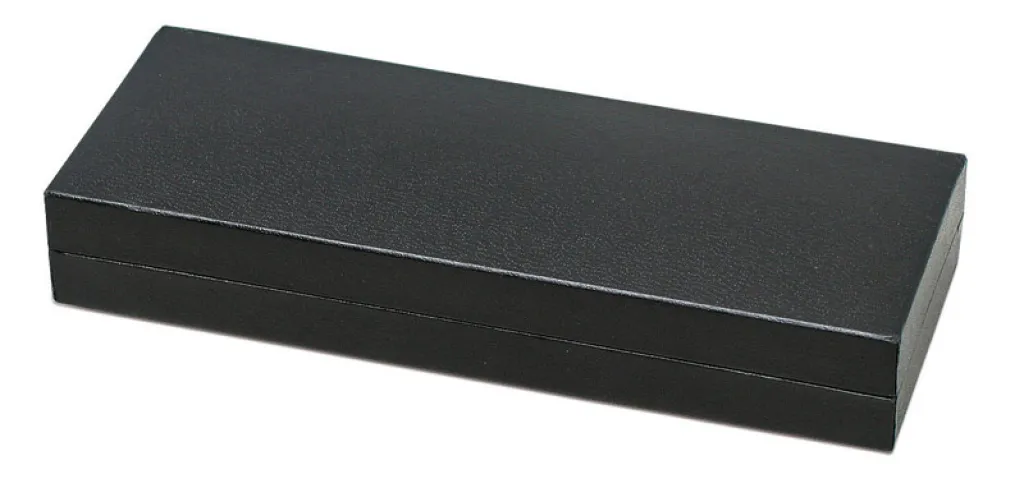 Writing instrument box made of black gift wrap covered by foil. The interior is lined with white fabric that beautifully exposes writing. We can print your logo on the lid. Fits all ball pen types.