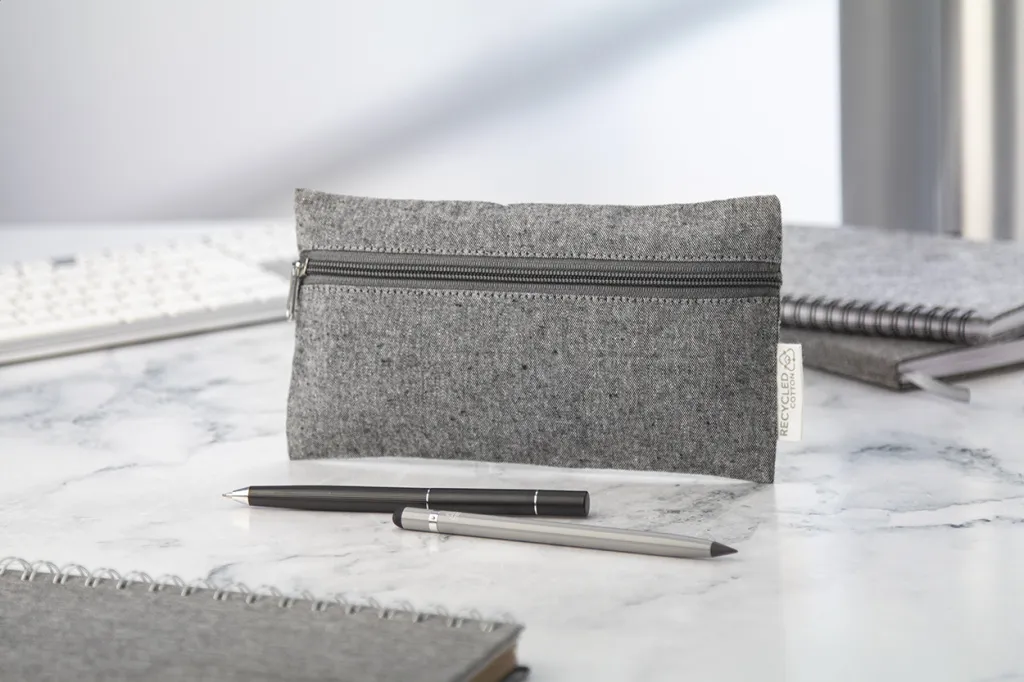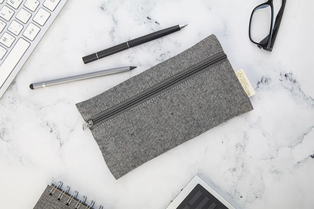Zipped recycled cotton pen case with distinctive label. 100% recycled cotton.