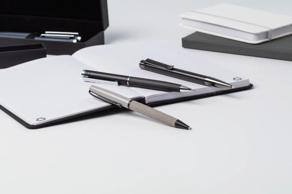 Elegant, metal ballpoint pen and roller pen set, with carbon patterned barrel and gunmetal finish parts. In carbon patterned gift box, with blue refill.
