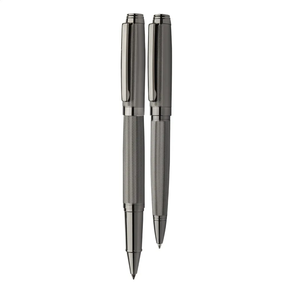 Elegant, metal ballpoint pen and roller pen set with patterned barrel. In black gift box, with blue refill. André Philippe brand product.