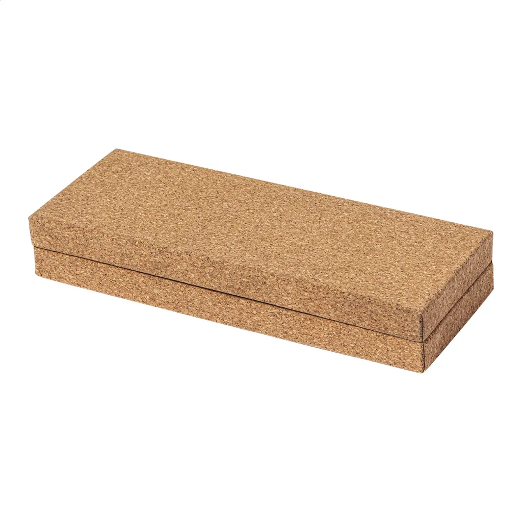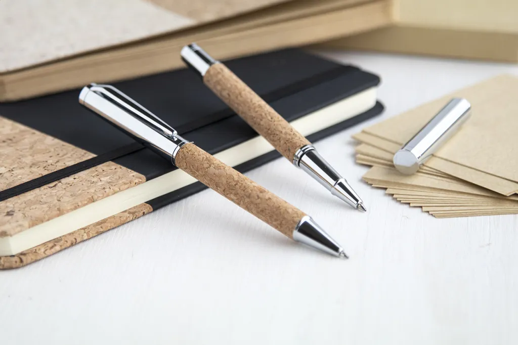 Elegant, metal ballpoint and roller pen set with natural cork covered barrel. In natural cork gift box, with blue refill.