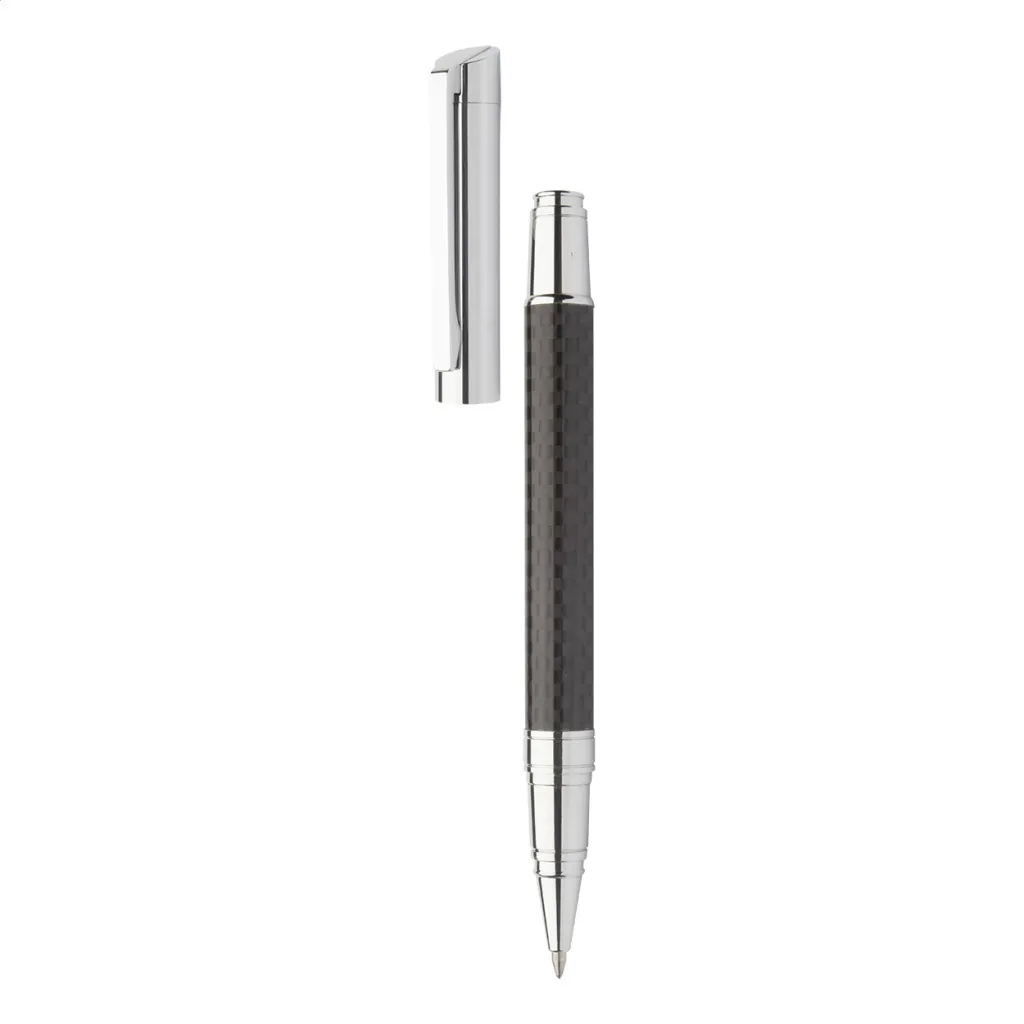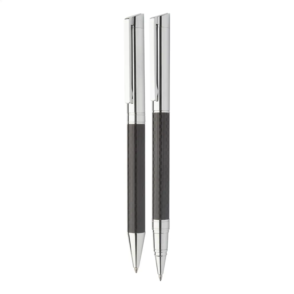Elegant, metal ballpoint pen and roller pen set, with carbon pattern barrel and shiny chrome parts. In black gift box, with blue refill. André Philippe brand product.