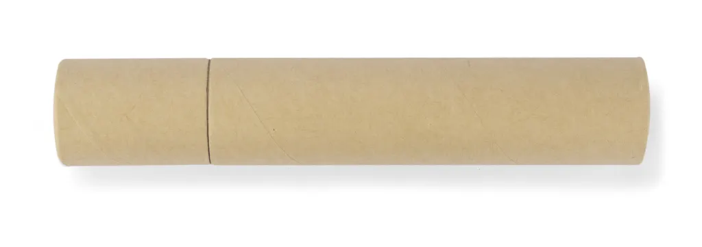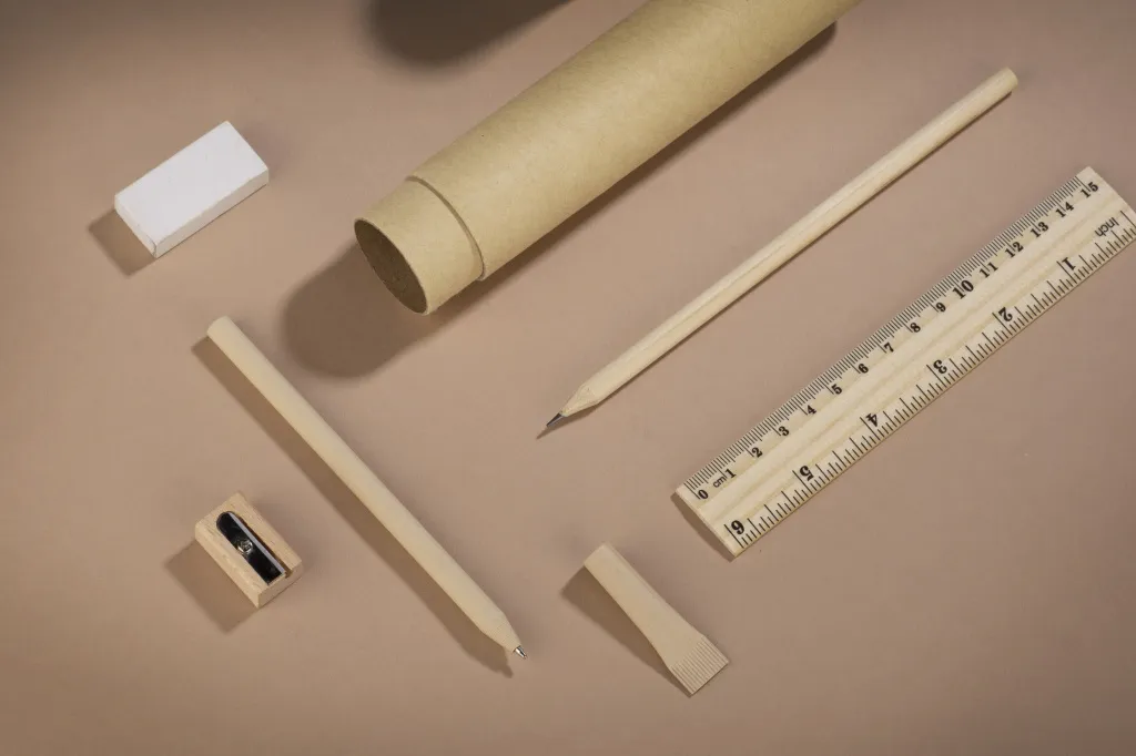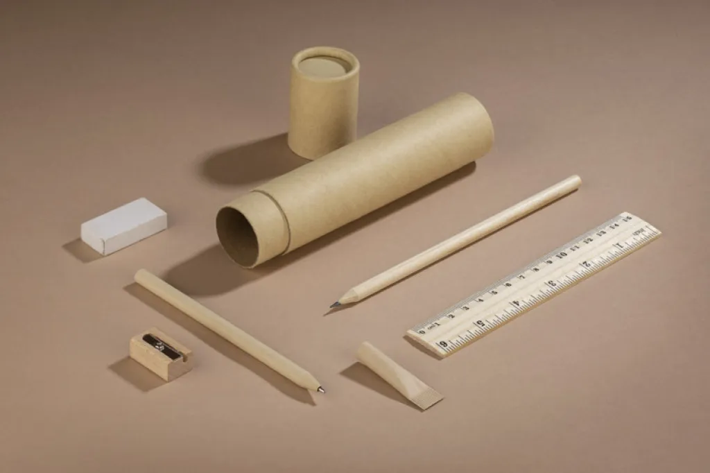 Ecological pencil case made of tube-shaped kraft paper. The set includes: paper pen and wooden: pencil, sharpener, ruler and eraser.