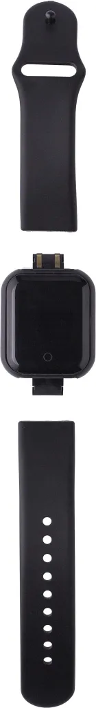 PET and PVC smart watch with adjustable wristband and wireless technology. With small button below the screen. Functions: heartrate, sleep monitor, oxygen measure, message reminder, drinking water reminder, exercise reminder. USB charger hidden in wristband.