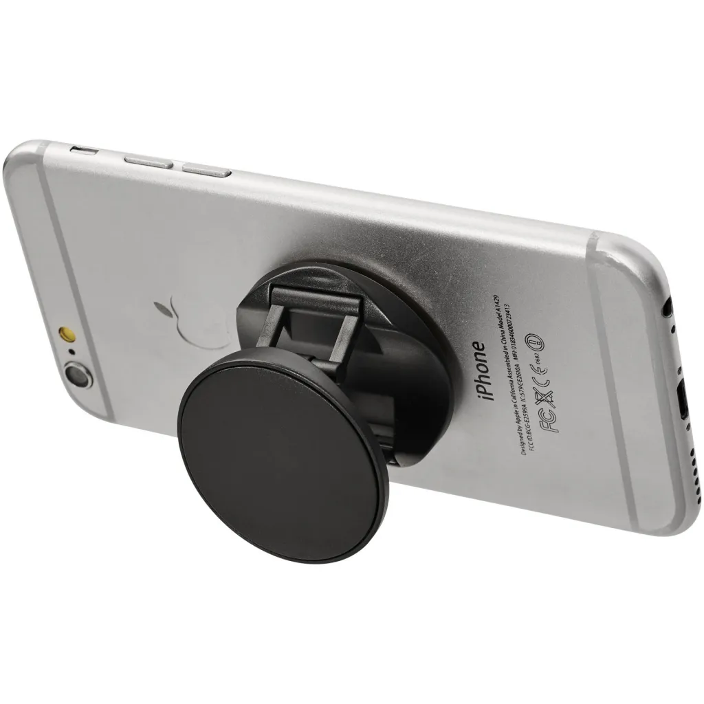 This item can be used as a phone stand or to secure a smartphone while holding it. Works great for watching movies on a smartphone or for taking selfies. Adhesive backing attaches firmly to the back of a smartphone.