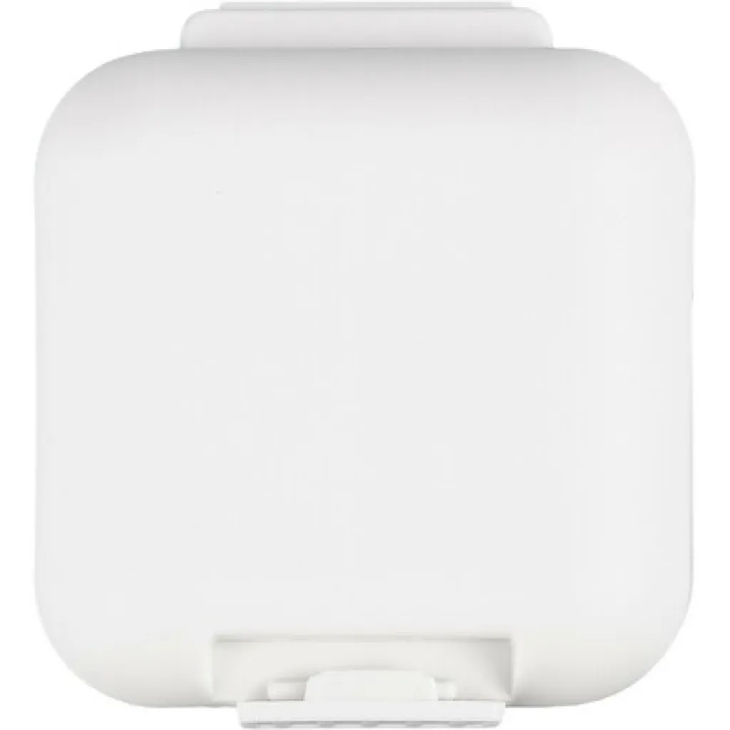 Pill box with 5 individual compartments, each with its own lid, features a clip closure for secure storage.